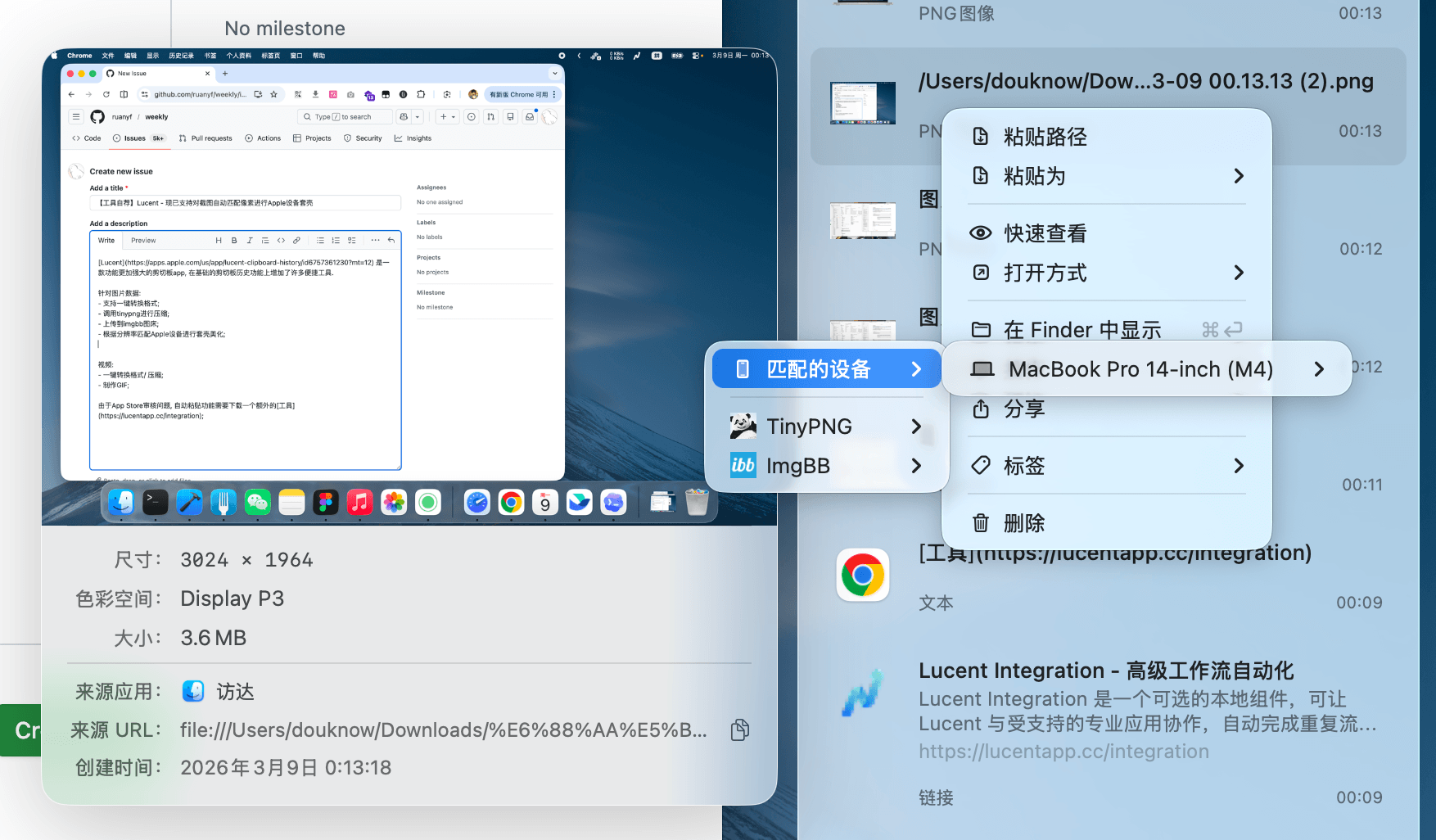 • 场景三:日常办公。 随手复制的图片想快速缩小体积发邮件?右键 Lucent 里的记录直接压缩,无需跳转。