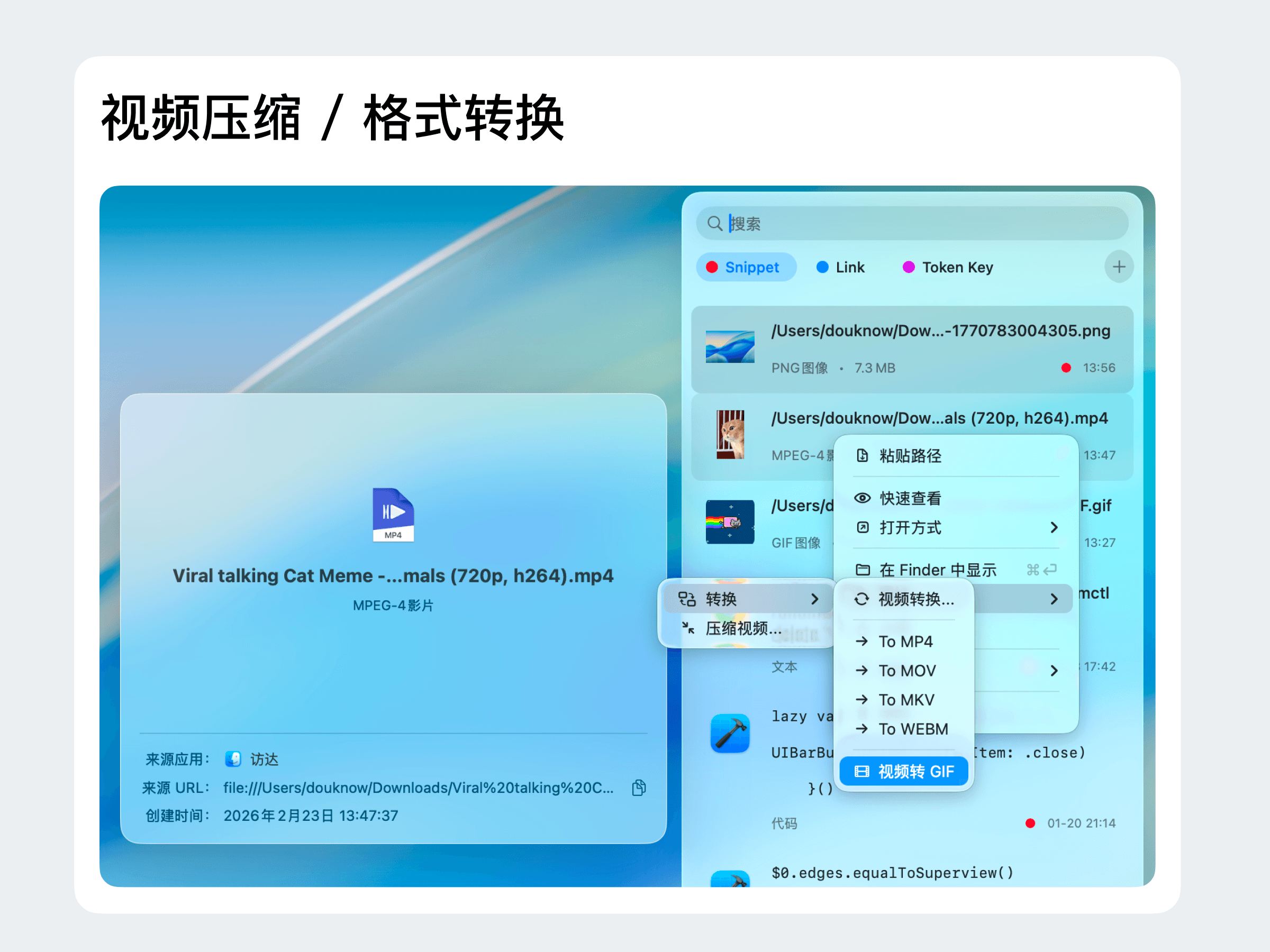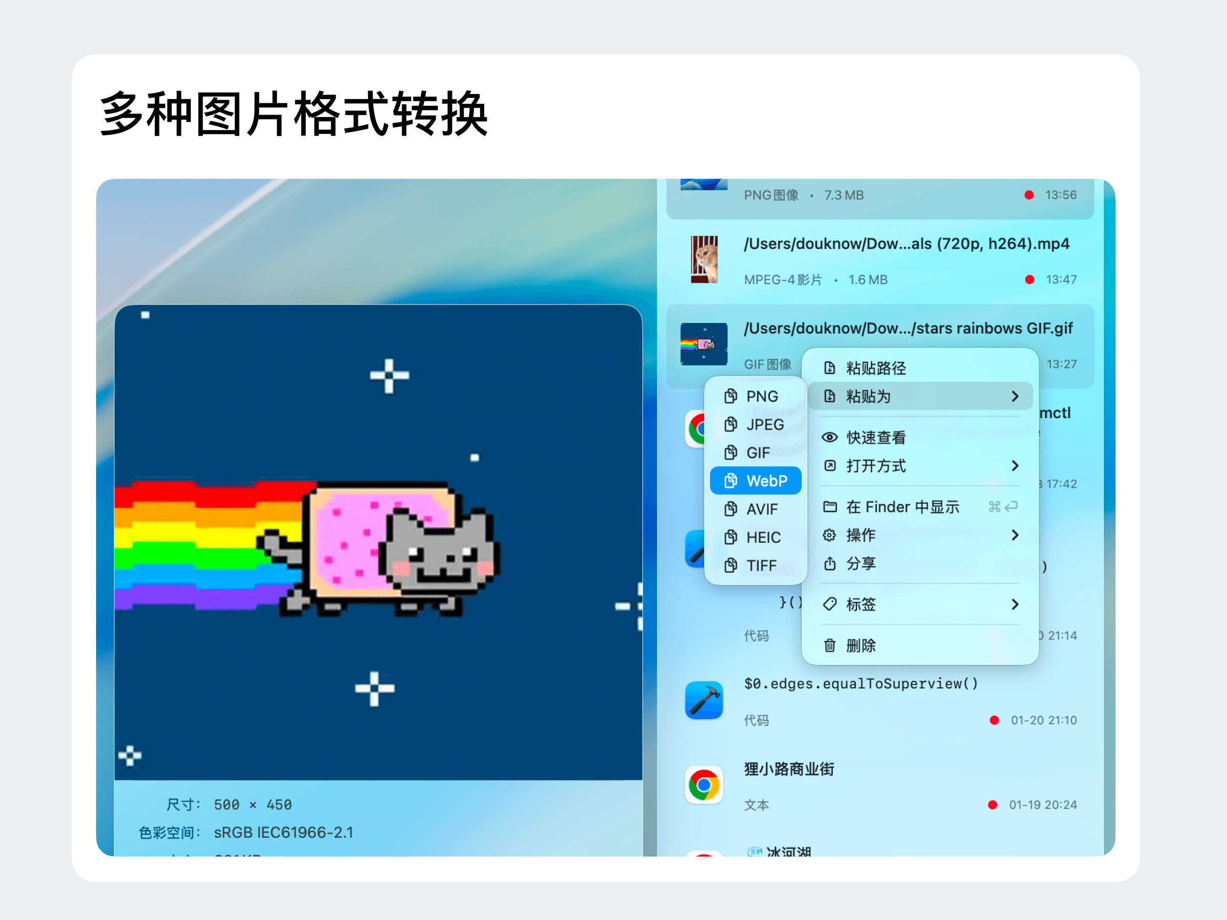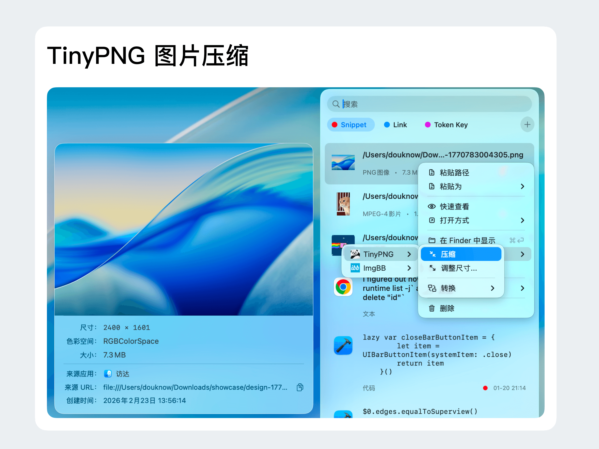 你是否也曾有过这样的烦恼:复制了一张图片想看分辨率,得点开 Finder 深层菜单;想把视频转个 GIF,还得去搜复杂的命令行;截了个图想发小红书,却发现光秃秃的图片一点都不美观……
