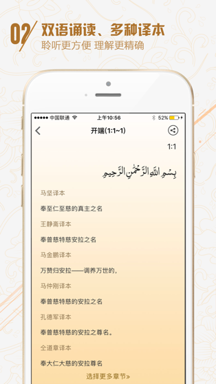 在《古兰经》版块,用户可聆听诵读、搜索关键字查询、对比多种中文译本(包含马坚、王静斋、马金鹏、马仲刚、孔德军等译本)及注解,加深对古兰经文的理解;支持手势放大缩小功能,可调整文字大小,给不同用户提供最舒适的视觉界面;支持复制文字、多节经文分享等功能,方便用户分享交流;支持书签和笔记功能,方便用户随时记录读经心得。