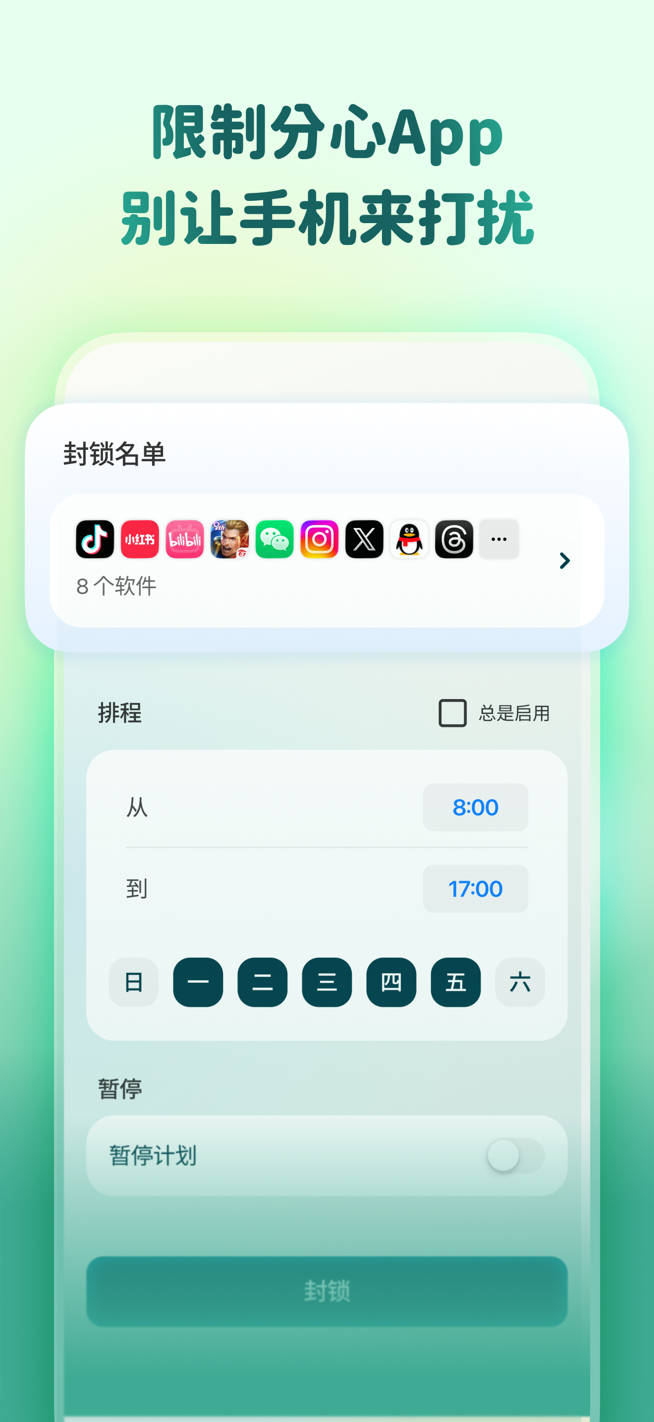 • 因应不同专注情境,自订你的应用程序白名单,种树时名单外的软件将会被屏蔽 (iOS 16 以上)