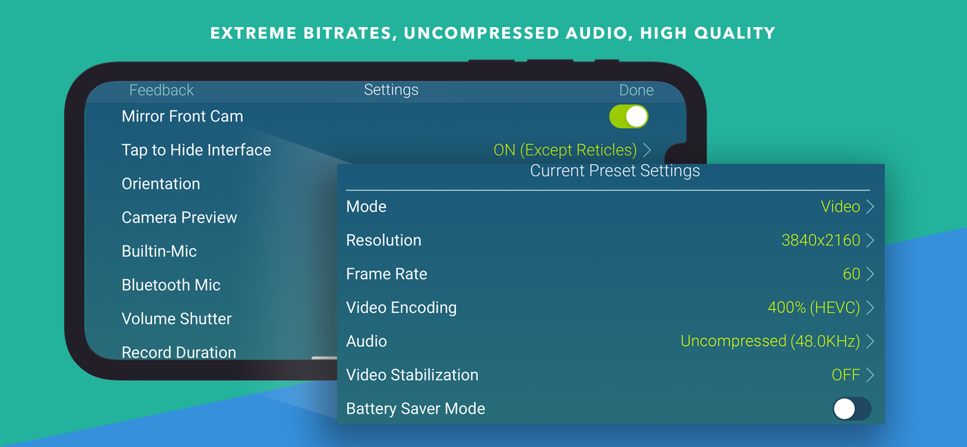 - Choose Video Bitrate and Compression (from 400% to 25% of native camera app)