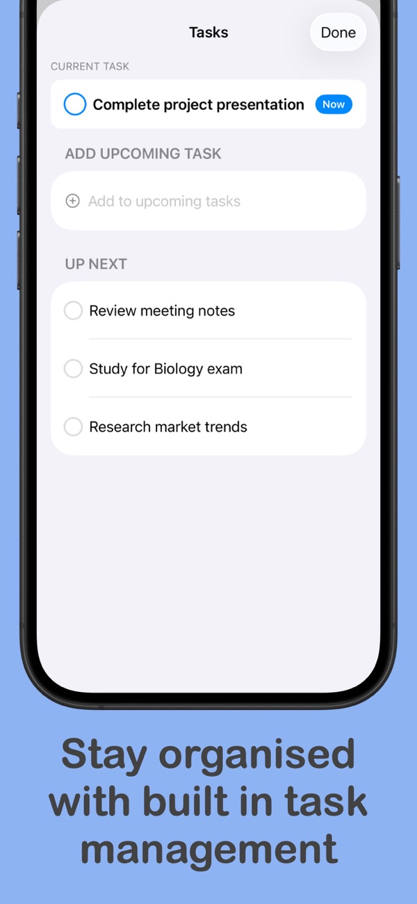 FlowFocus is a beautifully designed Pomodoro app that helps you stay focused and productive. Its interface is simple and modern, and the operation is intuitive. It has a smart Pomodoro that allows you to customize work and break durations; adopts a task-first approach, enabling you to track work content right above the timer; has a beautiful design with smooth animations and haptic feedback; can perform session tracking; settings are customizable; supports task management, allowing you to add, complete, and track tasks in the timer view. You can use it by following these steps: add tasks, start a 25-minute focused work session, take a short b...