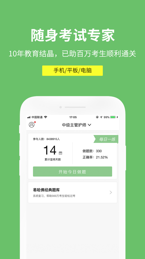 易哈佛题库包含有护士资格、初级护师、中级主管护师、 一建、二建、监理、造价、会计、药师、医师、主治、教师、银行、公务员等行业职称考试精准题库、快捷解释,极大节约考生的复习时间。手机版与网页版同步做题数据,随时随地做题。通过规范的做题,找出丢分题、薄弱点,加以理解消化,轻松消灭丢分死角