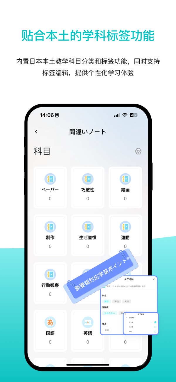GakuMate提供适用于日本小学、中学等教育课程的标签设置,便于高效整理注册的题目,学习更加得心应手。