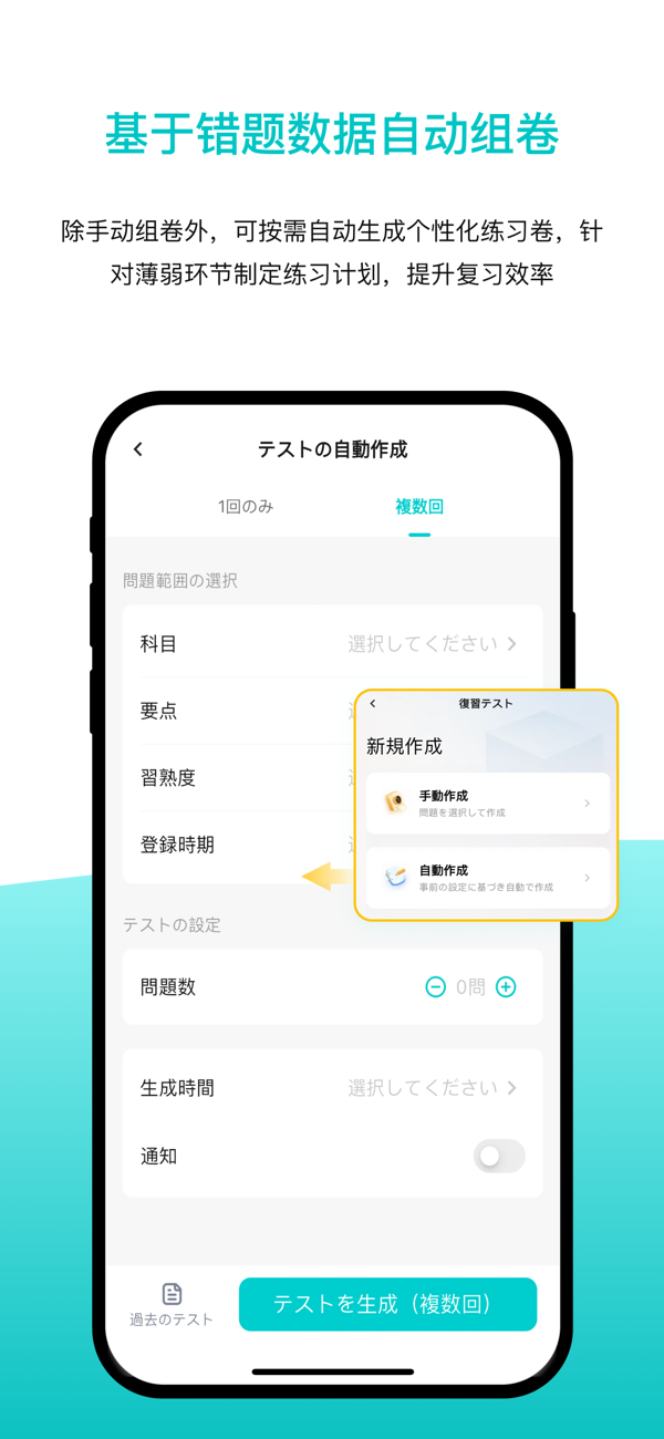为最大化学习效果,GakuMate可以根据过往错题的科目范围、记录时间及掌握程度,自动生成复习用的错题卷,使用户能够有针对性地加强薄弱环节,帮助其在短时间内大幅提升学习成绩,是备考和复习的理想选择。