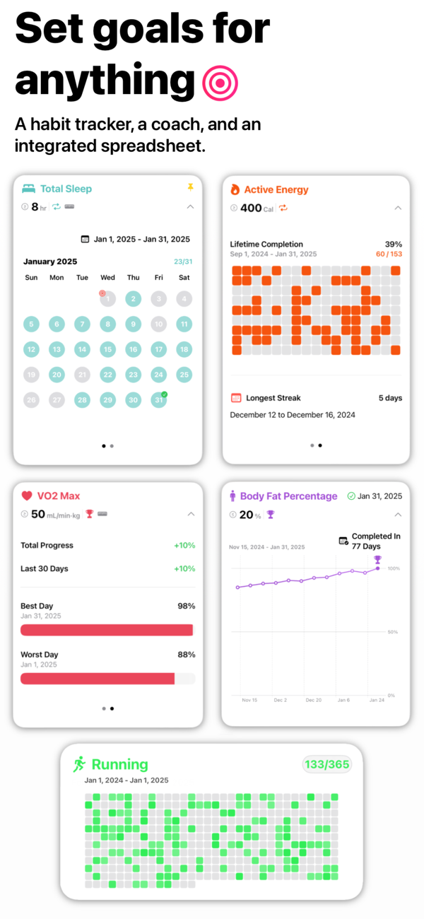With Coefficients, you can create organized dashboards of custom charts and widgets to visualize any of your health and fitness metrics at a glance or tap in for more detailed analysis. You can set goals for any data type to monitor your progress, visualize trends and relationships between different data types, and view your data over any timeframe. Coefficients allows you to chart any of the over 200 supported HealthKit data types as well as your own custom data types.