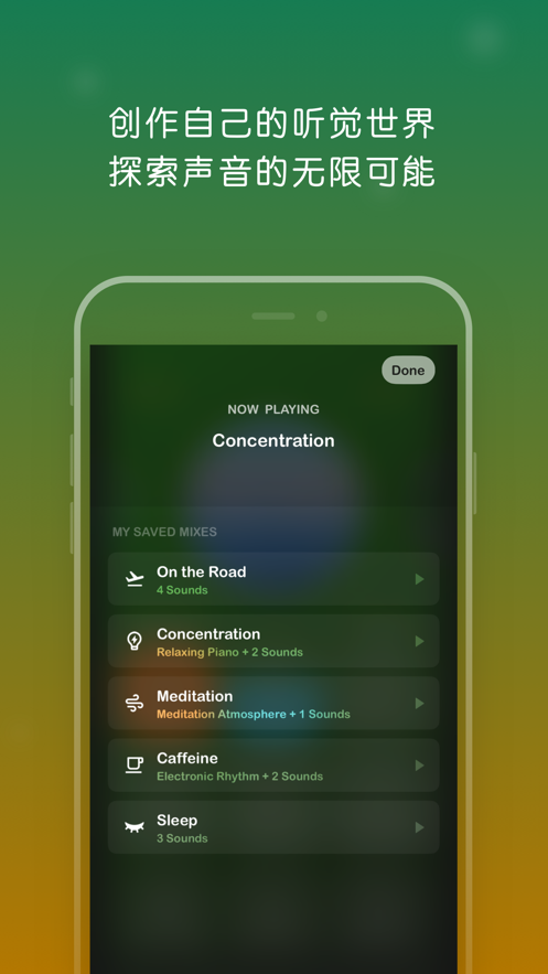 - Custom Mixing: Focus, Relax, Refresh, Sleep...