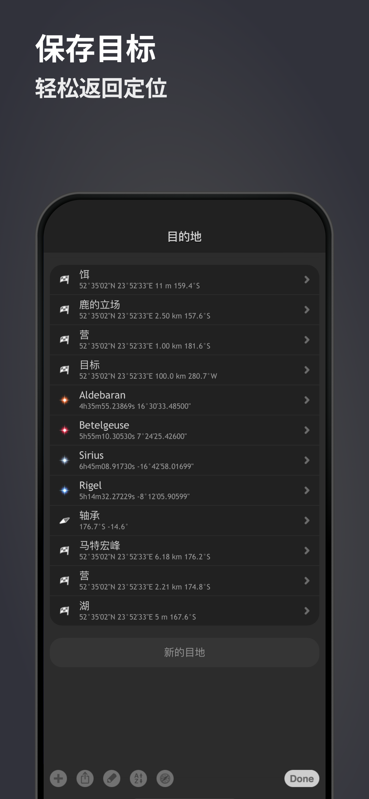 保存当前位置,从地图上添加点,手工输入位置坐标和方向,手工添加星星或使用内置的星星类别表