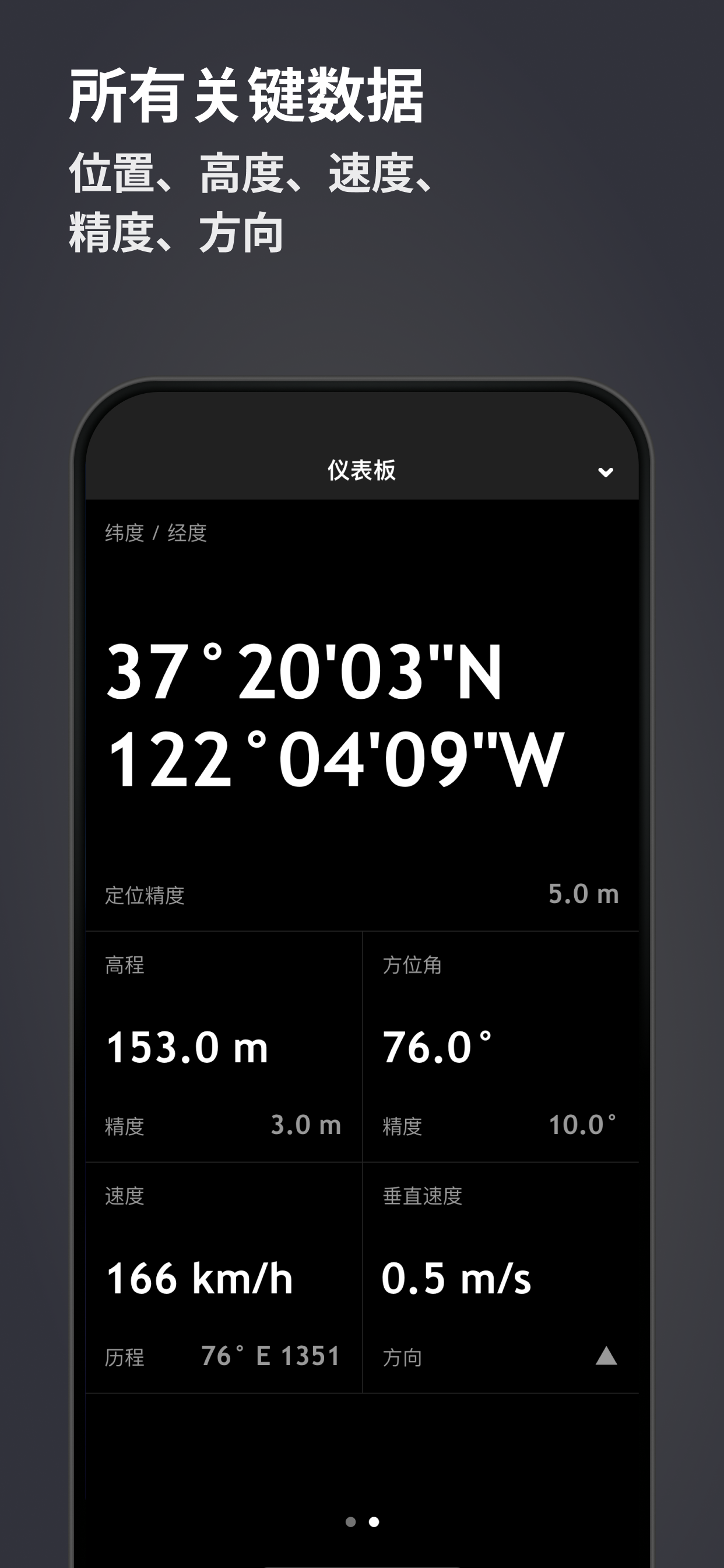 查找和跟踪您的位置并获取详细的实时 GPS 数据:数十种格式的坐标、海拔高度、路线以及当前速度、最大速度和垂直速度等数据;支持英制单位、公制单位、航海单位和测量单位。