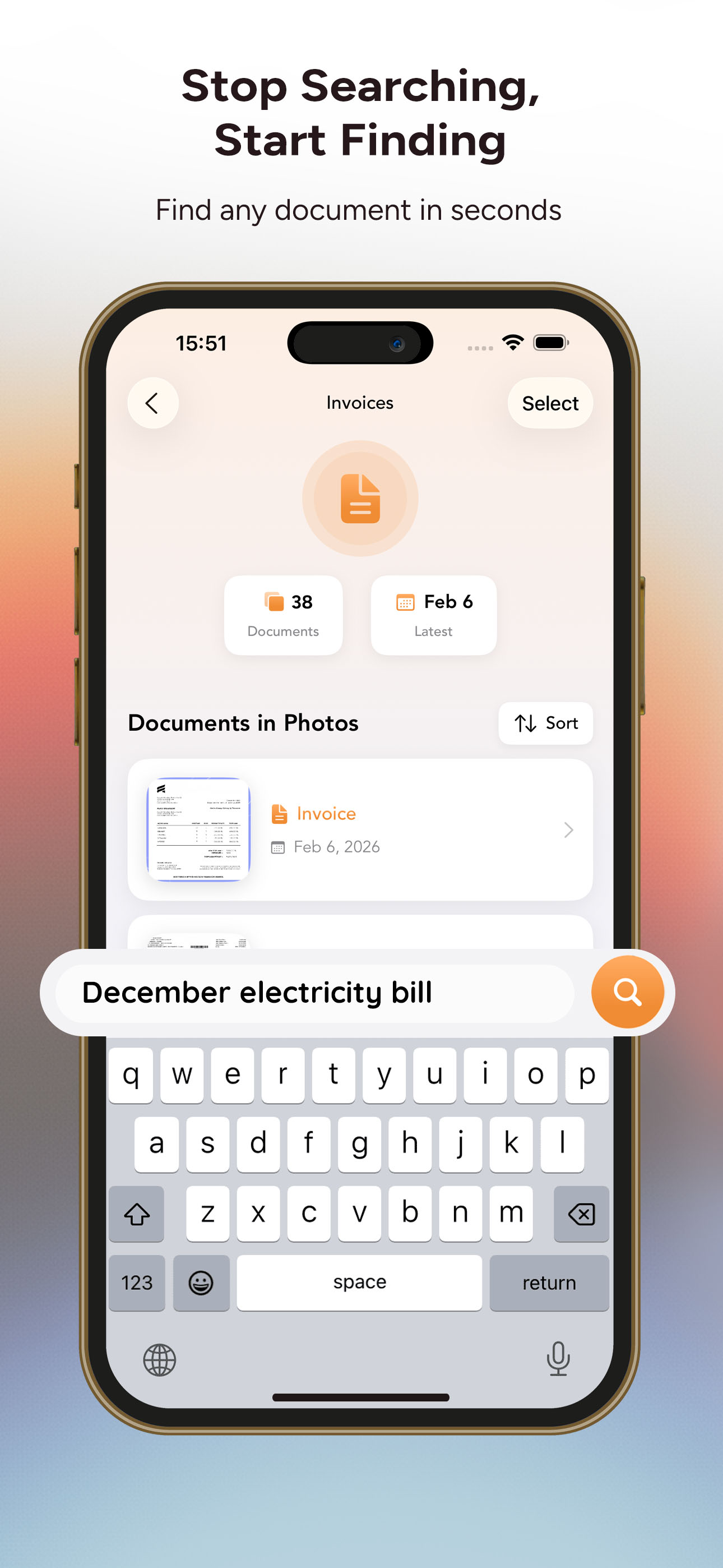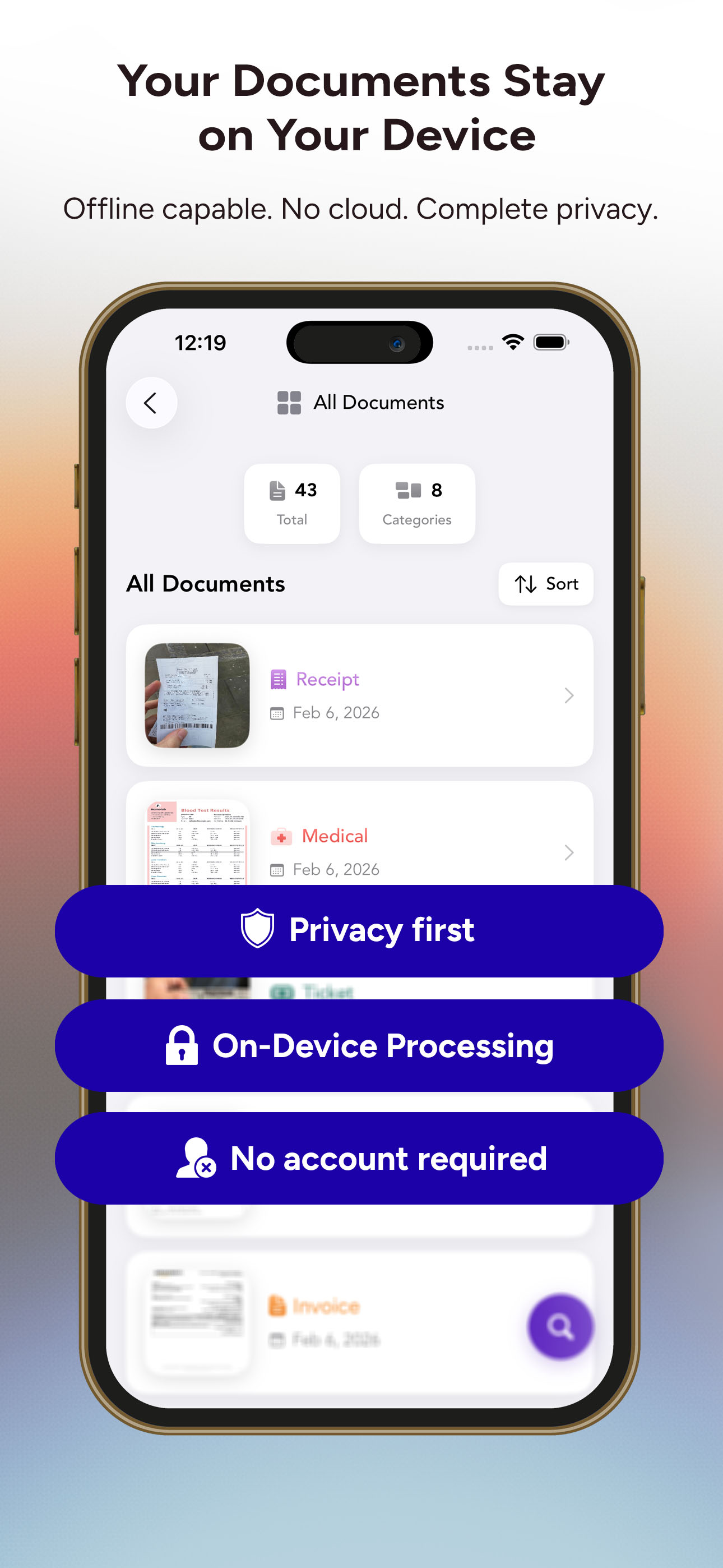 DocSort会自动找到并整理隐藏在你的照片应用程序中的每一张文档图片。厌倦了在数千张照片中滚动查找那张收据吗?DocSort为你承担繁重的工作。只需打开一次应用程序,然后看着它立即发现并分类你所有的文档照片——无需扫描,无需手动分类,毫无麻烦。 功能 - 强大搜索:通过即时文本搜索在几秒钟内找到任何文档。可在收据、发票、合同等各类文档中进行搜索。 - 智能自动整理:DocSort会智能地将你的文档分类为:• 收据、发票、医疗文档、身份证、票据、合同、其他。 - 值得信赖的隐私保护:你的文档太重要了,不能托付给云端。DocSort在你的设备上处理一切——无需服务器,无需跟踪,无需数据收集。你手机上的内容就留在你手机上。 - 与现有照片兼容:无需重新扫描或导入任何内容。DocSort可处理你已经拍摄的照片。只需打开应用程序,让它进行整理。 - 闪电般快速:能流畅处理1000多张照片。针对性能进行了优化,不会耗尽你的电池。 - 多语言支持:目前可识别英文和土耳其语文档,更多语言即将推出。 - 无需账户:立即开始整理。无需注册,无需登录,无需提供个人信息。 为什么选择DocSort? 不要再浪费时间在你的相机胶卷中寻找重要文档了。无论是去年的保修收据、医疗处方还是你的保险卡。DocSort都能立即找到它。 立即下载DocSort,掌控你文档的混乱局面。 隐私至上。具备离线功能。轻松整理。