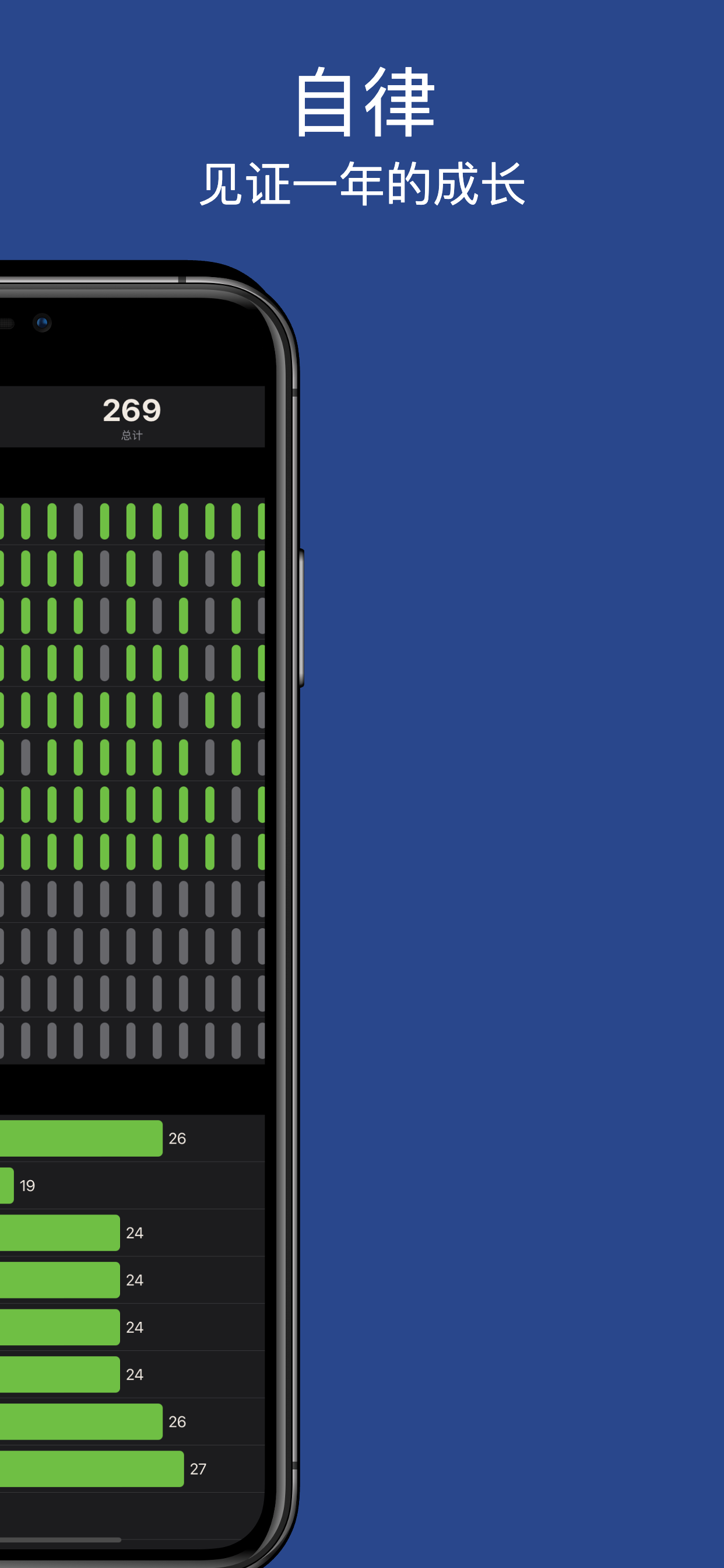 - 简洁明了的周度、月度和年度的打卡统计;