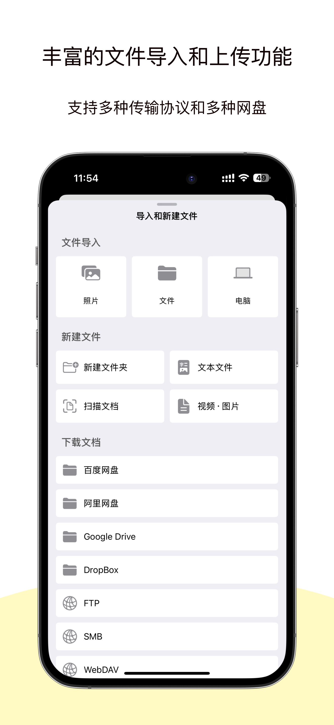- 支持从SMB,FTP,iCloud Drive,WebDav, 二维码扫描上传下载等方式导入文件