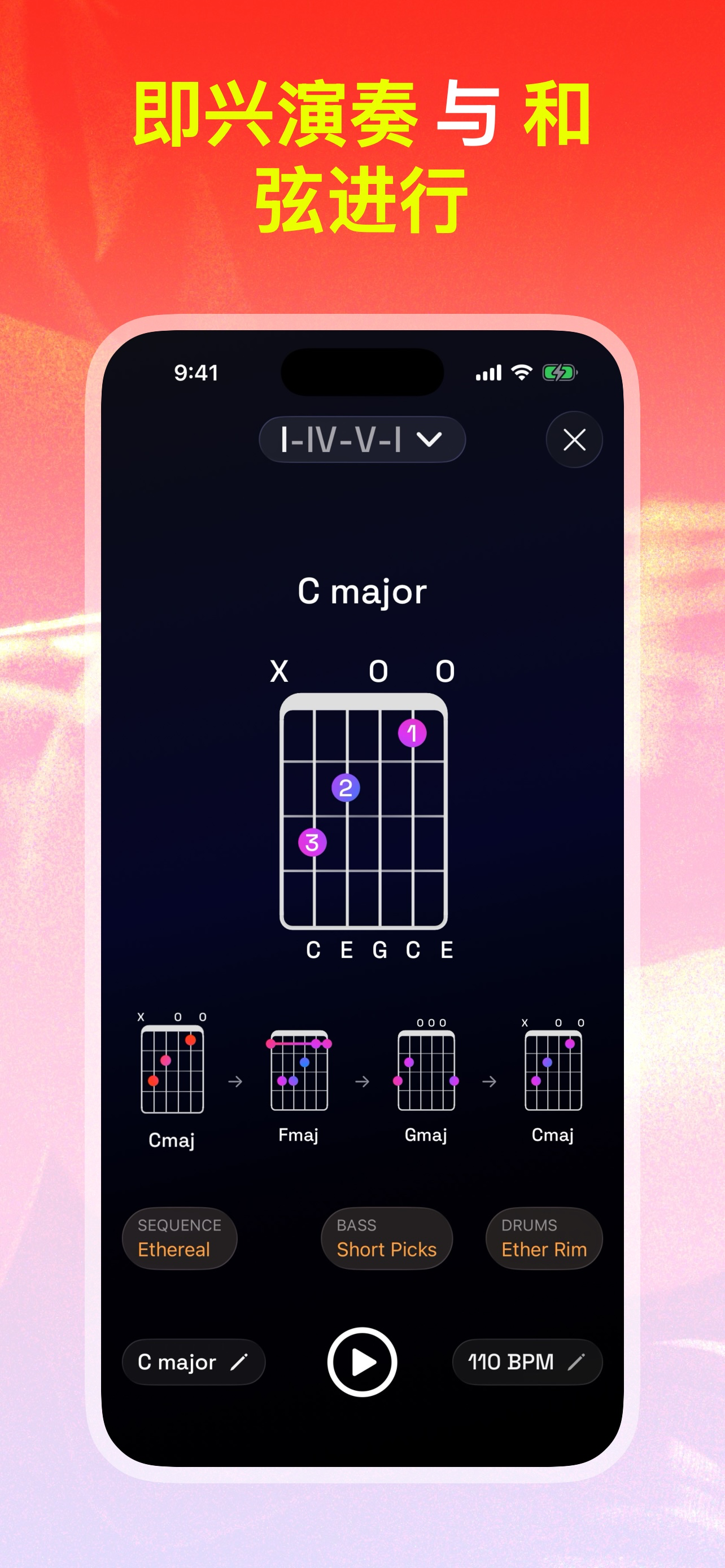 使用内置的吉他、贝斯和鼓模式,跟随常用和弦走向一起 Jam。
