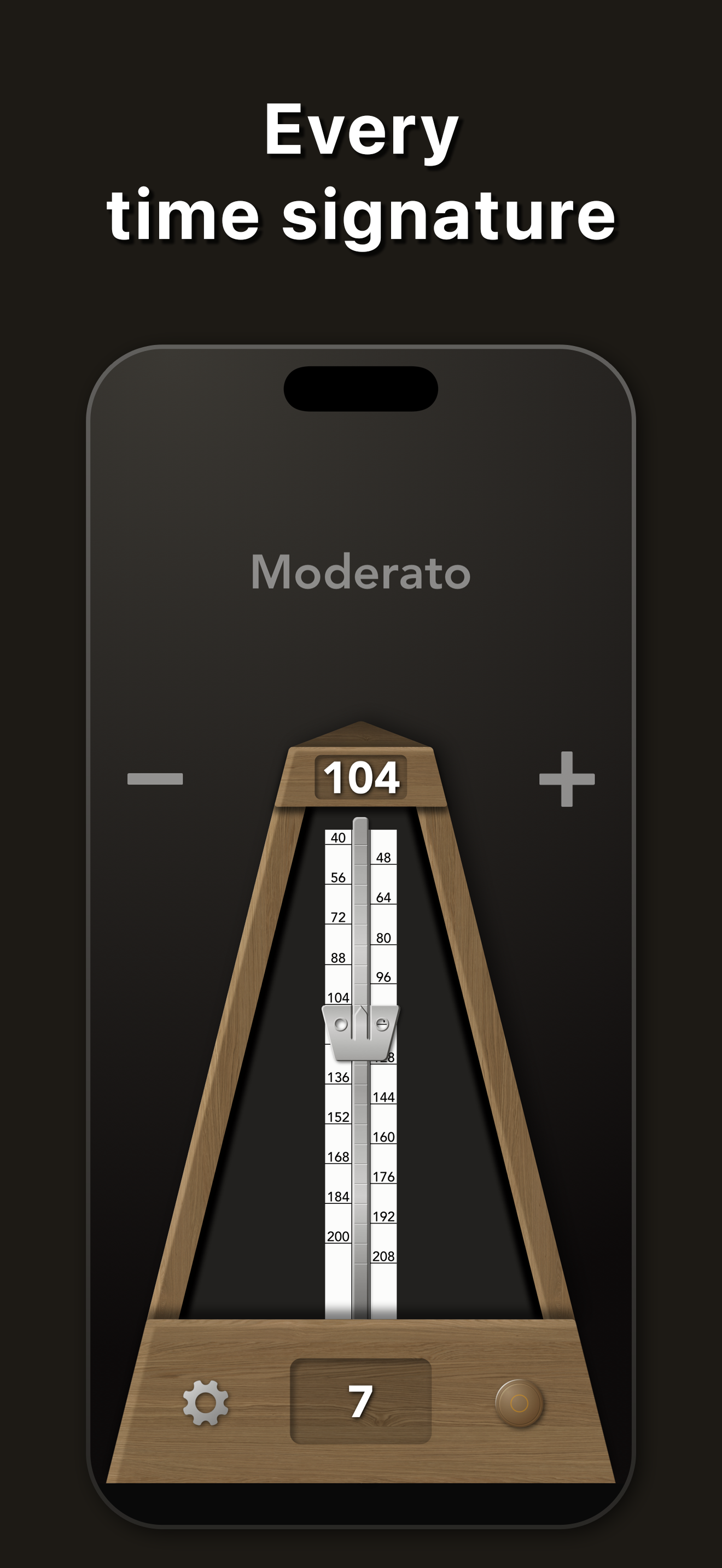 一键启动节拍器 — 拖动配重,选择拍号,开始练习。每一拍均来自真实机械节拍器的录音,细微的自然变化让长时间练习依然舒适。