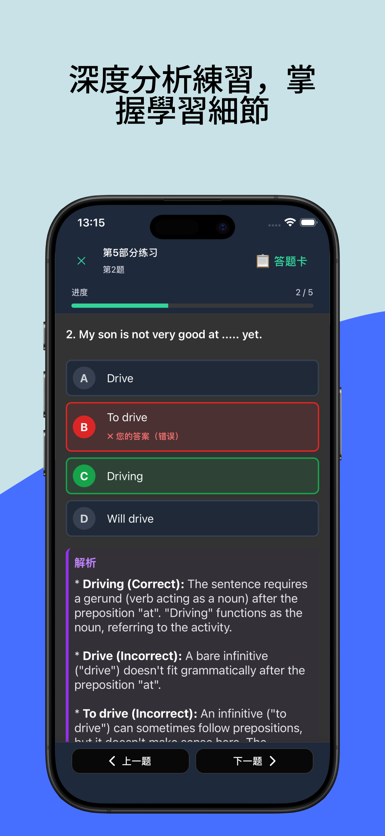 從基礎到進階概念,我們的語法部分涵蓋所有內容。每個課程都包含詳細的解釋和練習,並附有深入的答案解析,確保您真正理解每個規則。