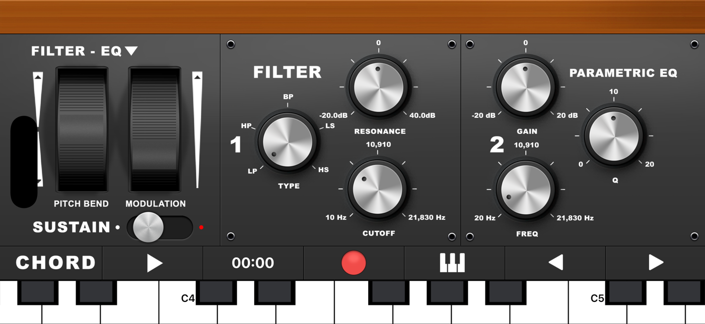 • 高级滤波器和均衡器:使用五种滤波器类型(低通、高通、带通、低架、高架)塑造您的音色,这些滤波器具有截止和共振功能,此外还有用于增益、Q 值和中心频率调整的参数均衡器。
