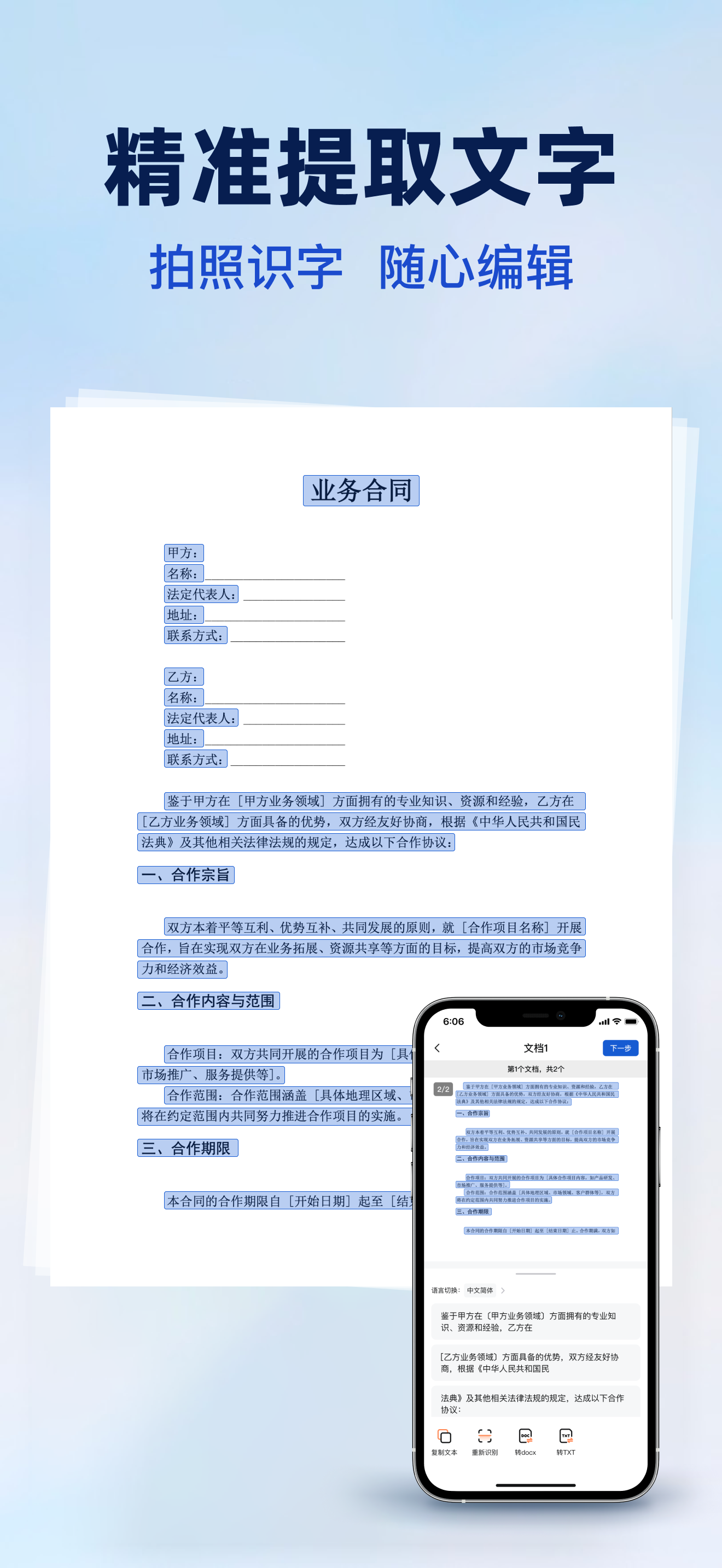 - 提取文字信息:从扫描的文档、图片中提取文字,用于编辑、复制、粘贴到其他应用程序中,节省手动输入时间,提高工作效率。