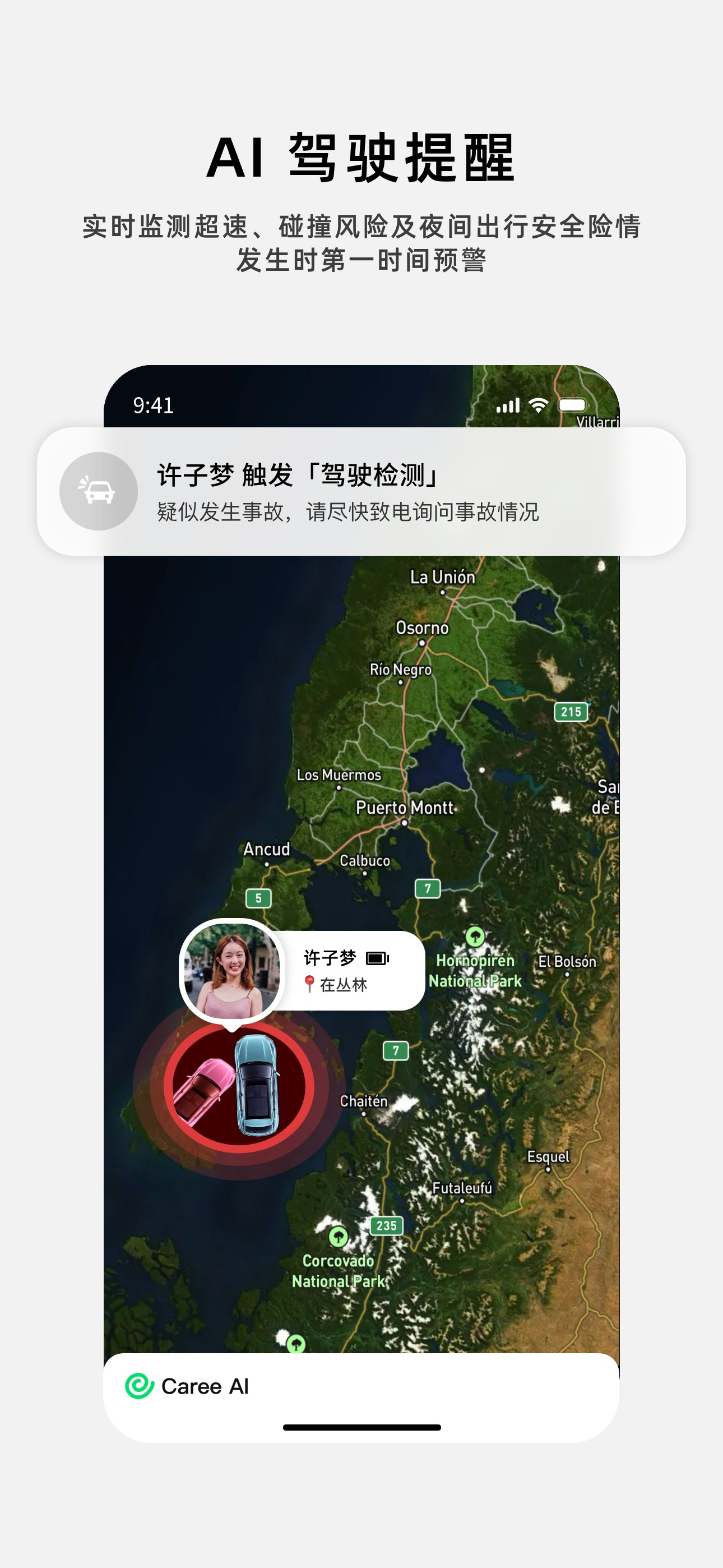 只需轻松添加好友,无论是温馨的家中、忙碌的办公室、充满活力的校园,还是广阔的户外场景,Caree AI 都能时刻守护你的家人。当家中的小孩在骑行时出现超速行为、伴侣驾车遭遇碰撞意外、老人不慎摔倒,甚至出现失联等各类危险状况时,你都能第一时间收到精准的系统通知,让你及时掌握家人的安危