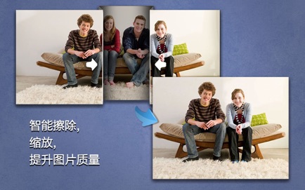 智能调整照片尺寸,它可以智能改变照片中物体之间的距离、从照片中删除某个人,让一张照片中的人或物离的近一点。