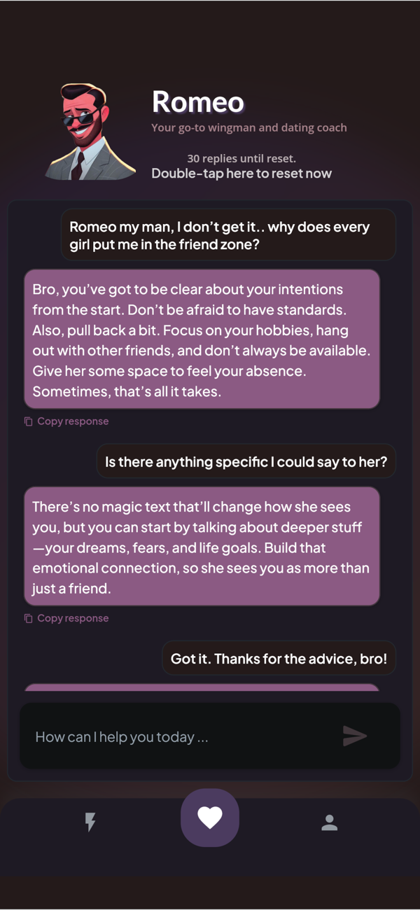 Meet Romeo – your personal AI Dating Assistant, designed specifically for young men who find themselves unsure of what to say when talking to girls or need some extra dating advice.