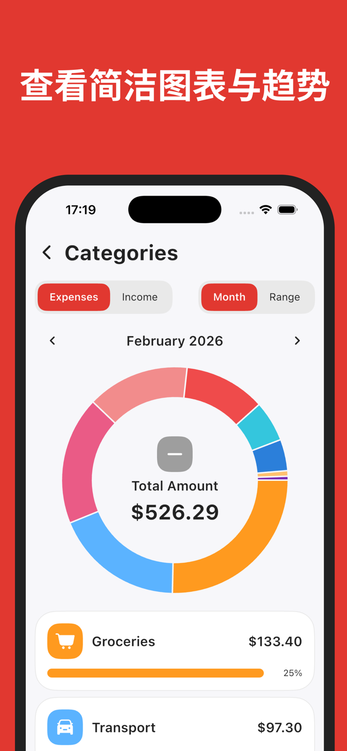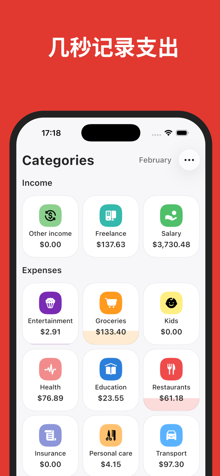 几秒钟就能添加收入、支出和转账。自定义分类和图标,让每笔账目一目了然。
