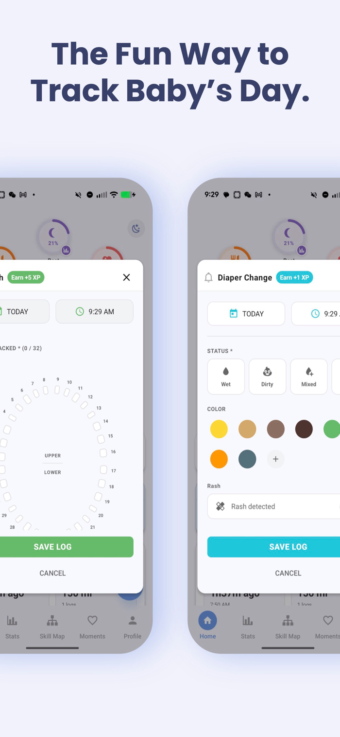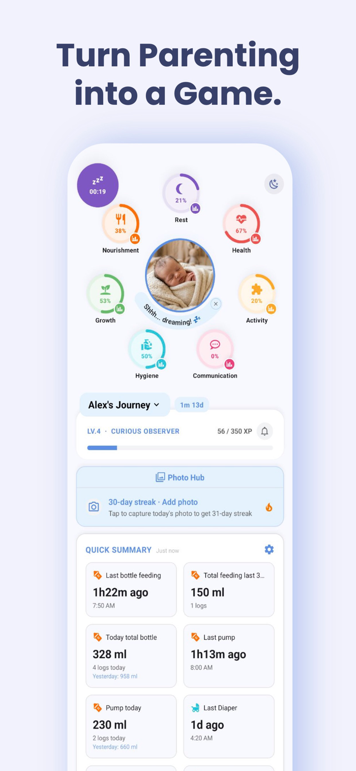 Turn every feeding, nap, and diaper change into progress on a beautiful radial skill map. Watch your baby level up from Newborn to Legend while capturing every precious milestone along the way.