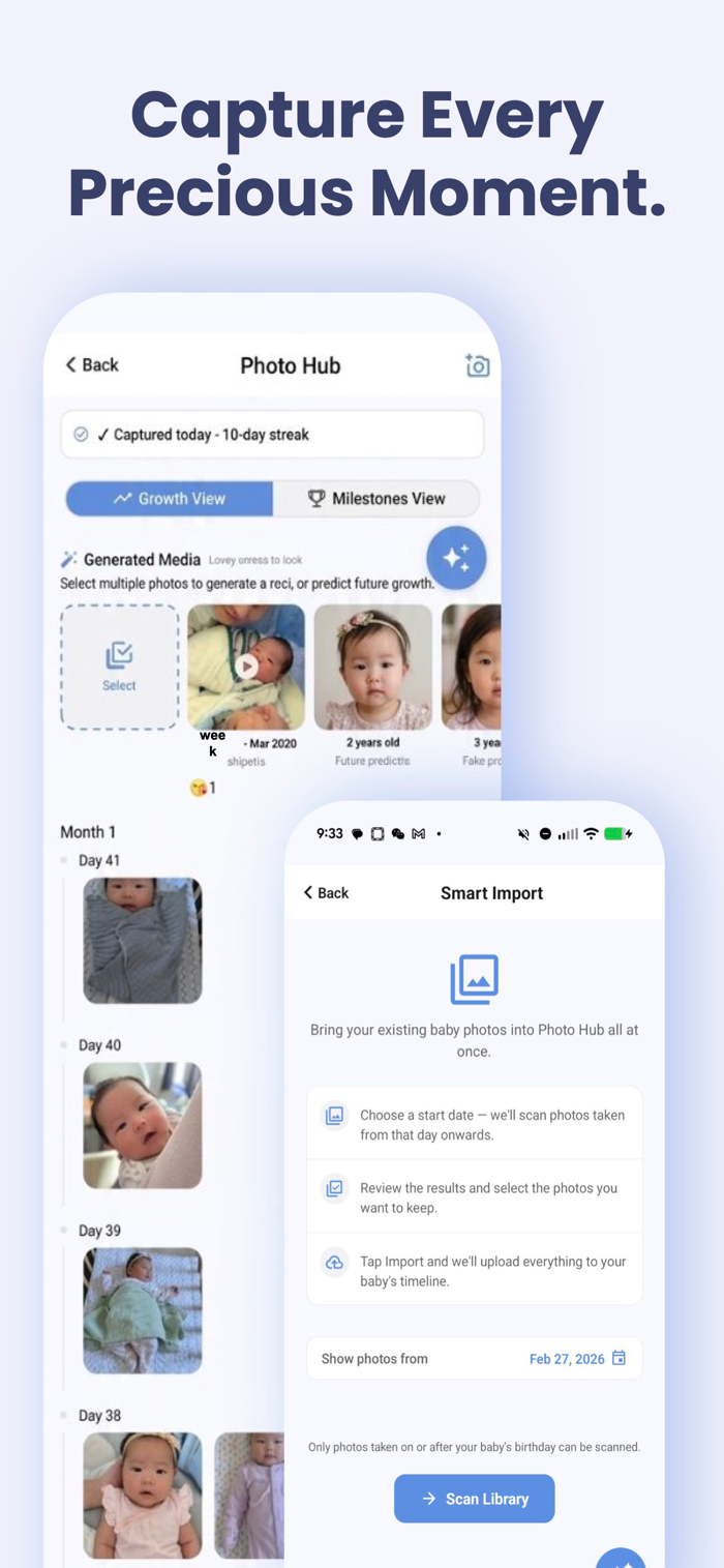 8. SMART AI IMPORT Save hours of manual logging with our intelligent photo importer that scans your library for baby photos and suggests logs automatically.
