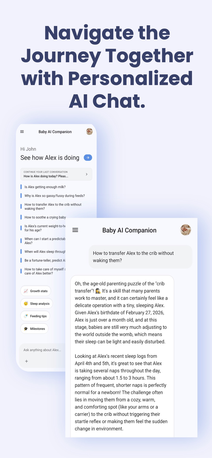 3. BABY AI ASSISTANT Get age-appropriate guidance and answers from your personalized AI assistant, powered by Gemini. Chat anytime for tips on sleep, feeding, and milestones.