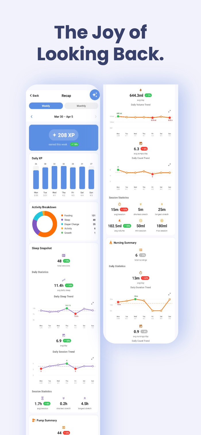 13. INSIGHTS & ANALYTICS Pattern charts, weekly XP bar chart, and growth curves help you understand your baby’s rhythms and developmental progress.