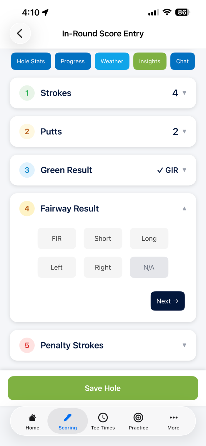 Enter scores hole-by-hole during your round or after. Track fairways hit, greens in regulation, putts, and more. Review and post your scores when you're ready.