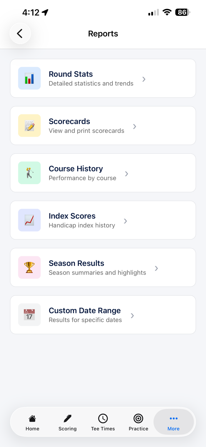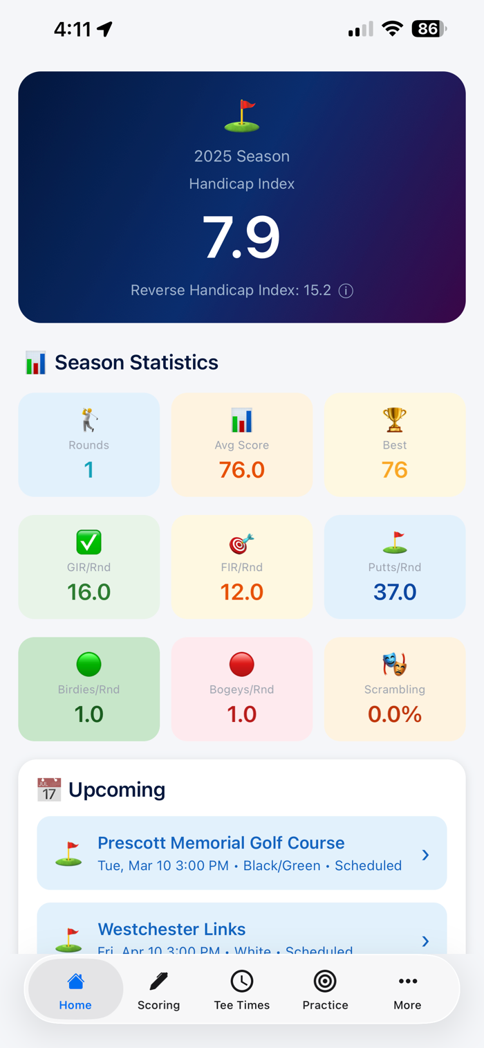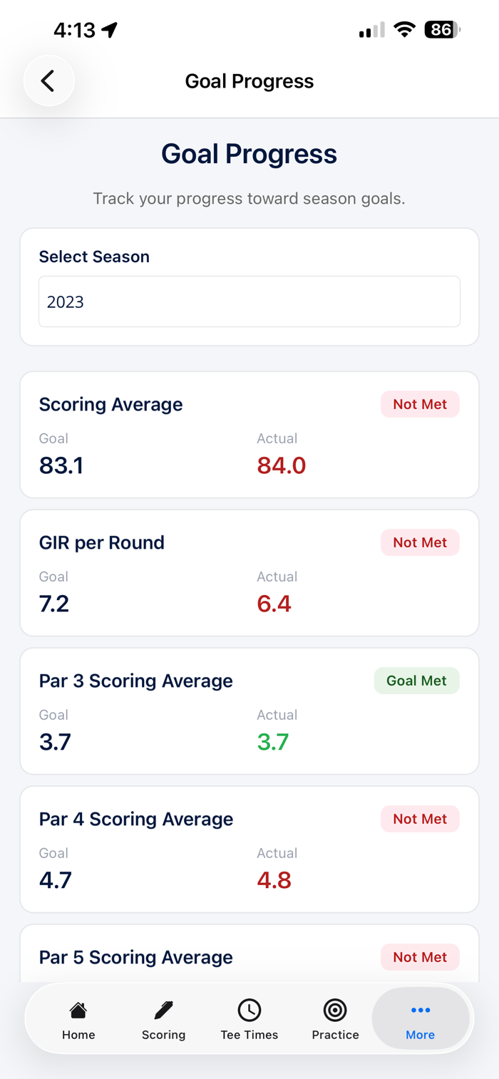 View detailed performance stats including average score, GIR, FIR, putts per round, scrambling percentage, and birdies. Analyze trends by course, by season, or across custom date ranges. View full scorecards for any round.