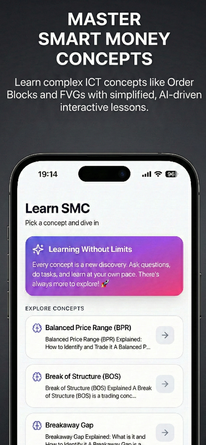 Unlock the secrets of institutional trading with SMC Ai. Whether you are learning Inner Circle Trader (ICT) methodologies or refining your Smart Money Concepts, our app provides the tools you need to succeed.