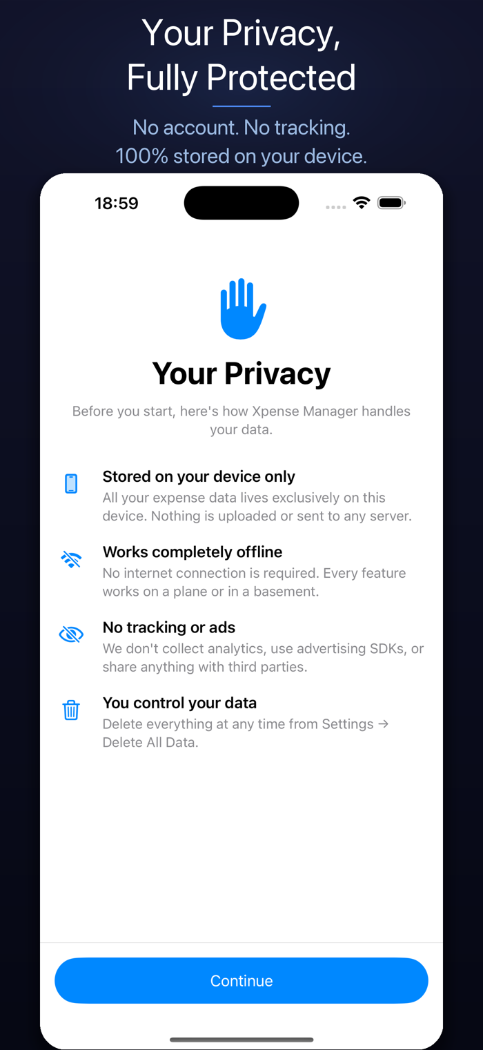 Your financial data never leaves your device. No account. No tracking. No analytics. No backend. Fully offline. GDPR-compliant: delete everything in one tap via Settings → Delete All Data.