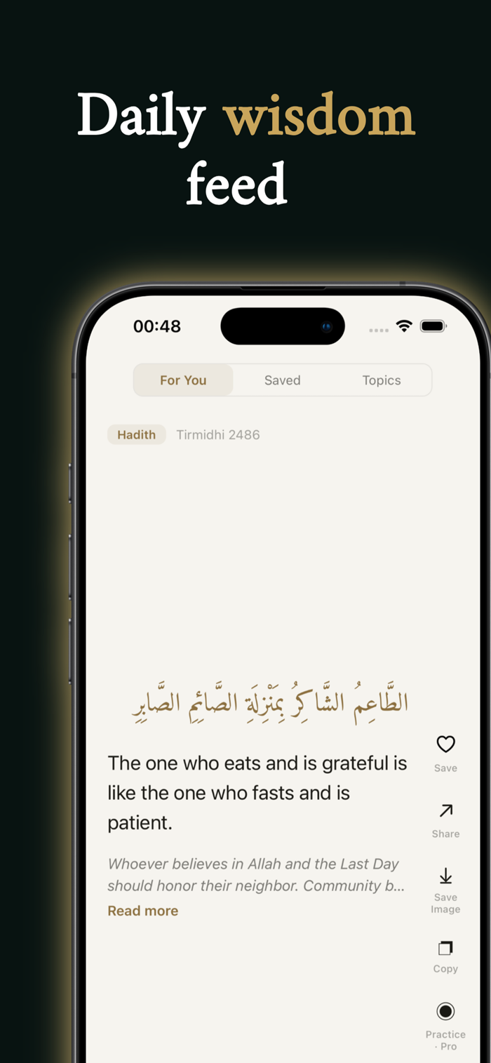A curated Qur'an verse, Hadith, or Du'a delivered fresh every day — displayed with original Arabic alongside the English translation. Save your favorites, share as beautiful images, and browse the full collection by theme.