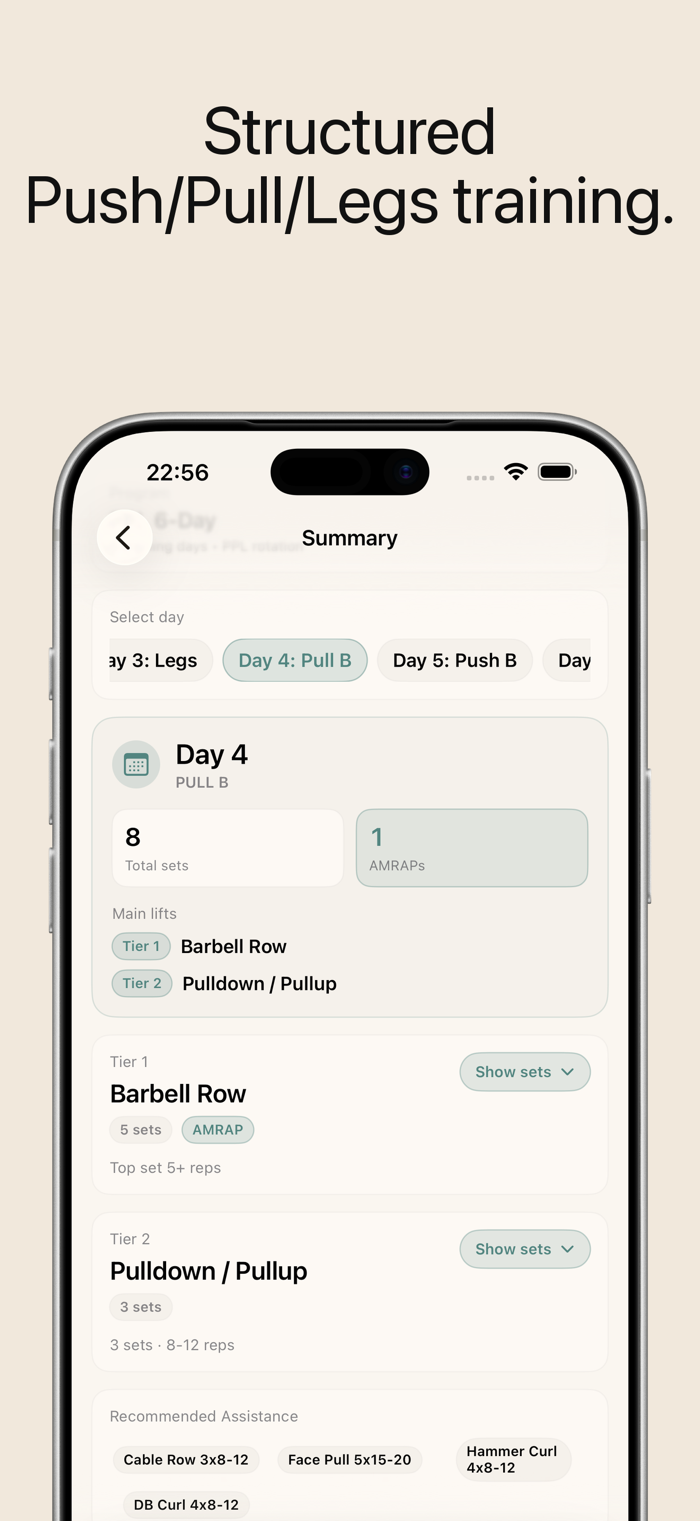 PPL Weightlifting是一款专为举重者打造的专注于推/拉/腿部训练的追踪器,具备自动智能进阶功能。可通过AMRAP组记录主要举重动作,由应用程序自动增加重量,必要时手动编辑。能追踪二级训练动作及配件,记录上次重量、快速添加并设置休息计时器。可按周期查看训练历史、做笔记,支持以千克或磅为单位训练。