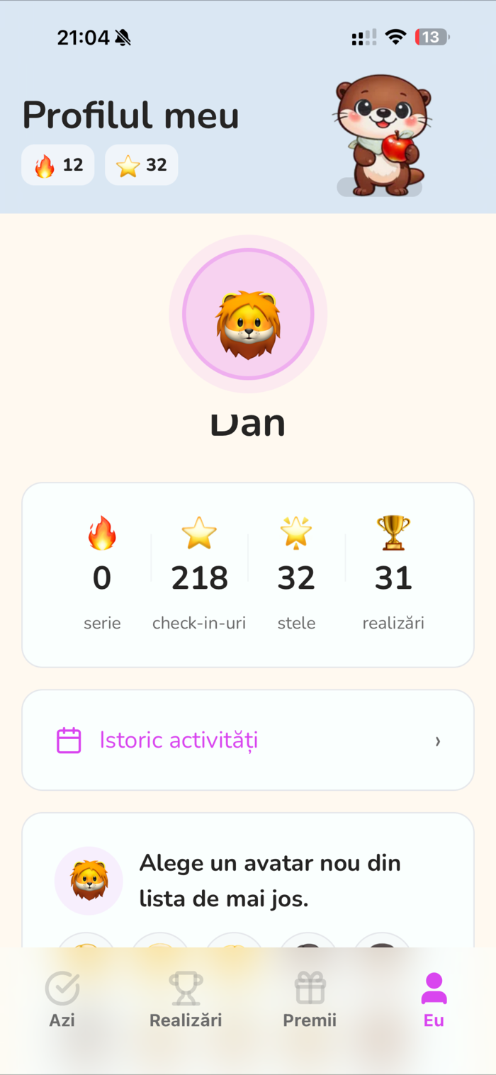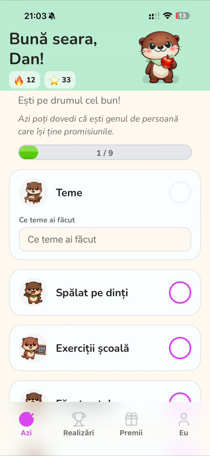 Creeaza activitati personalizate, urmareste progresul si rasplateste efortul cu premii si realizari. Copiii adora seriile de zile consecutive - iar tu vei adora sa ii vezi cum cresc responsabili.