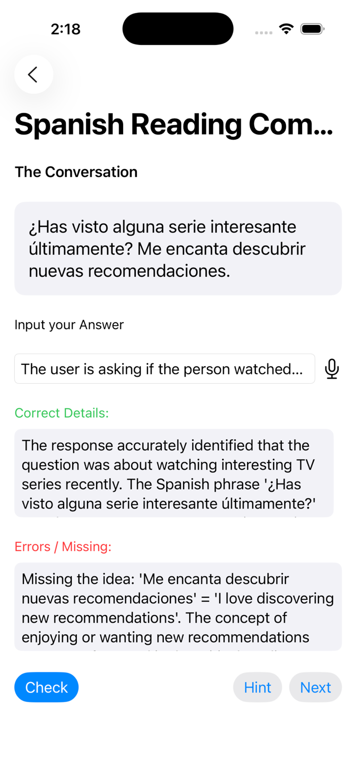 Learn how to speak Spanish in a conversation. Get the Spanish and English word break down combinations. Test your understanding of Spanish using reading comprehension where ai will determine your accuracy in understanding the Spanish Conversation.