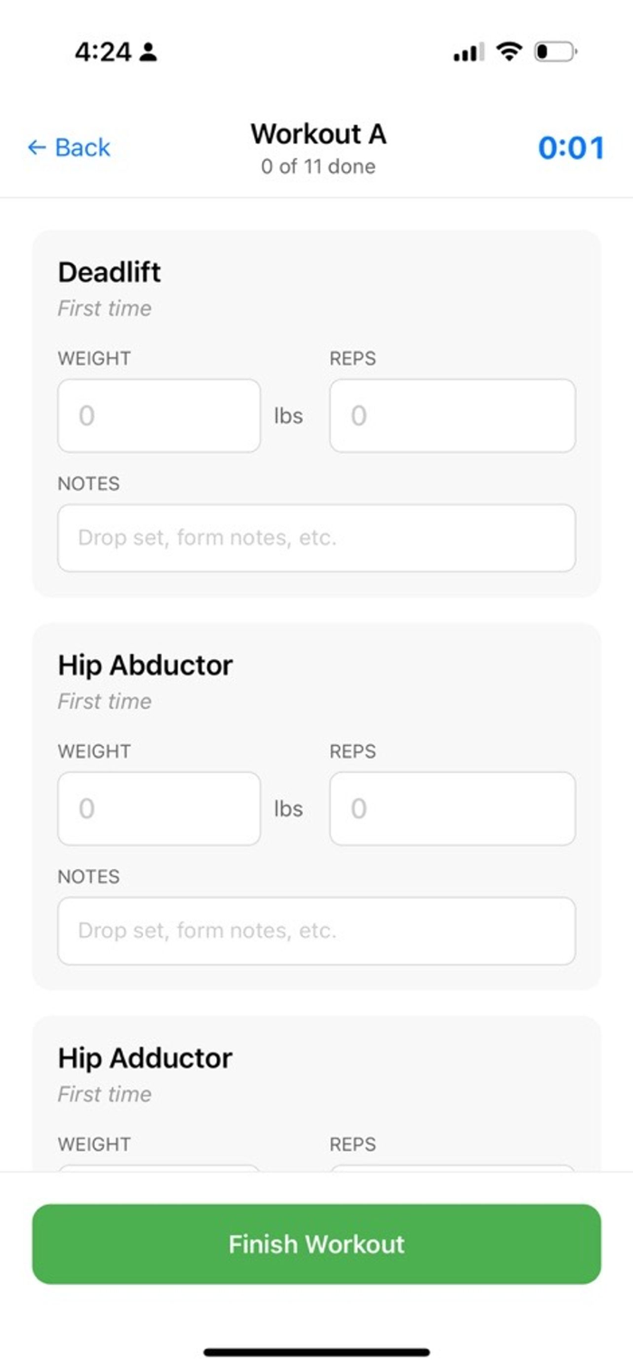 - Full workout history with duration tracking