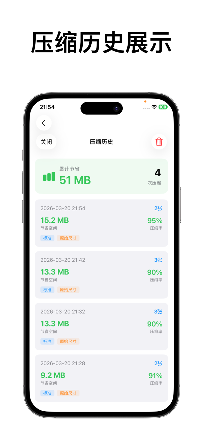 应用界面重点突出“压缩前后对比”和“累计节省空间”的价值感。你可以直接看到原图大小、压缩后大小,以及一共节省了多少存储空间。每一次压缩都更清楚、更可感知,不只是单纯点一下按钮而已。