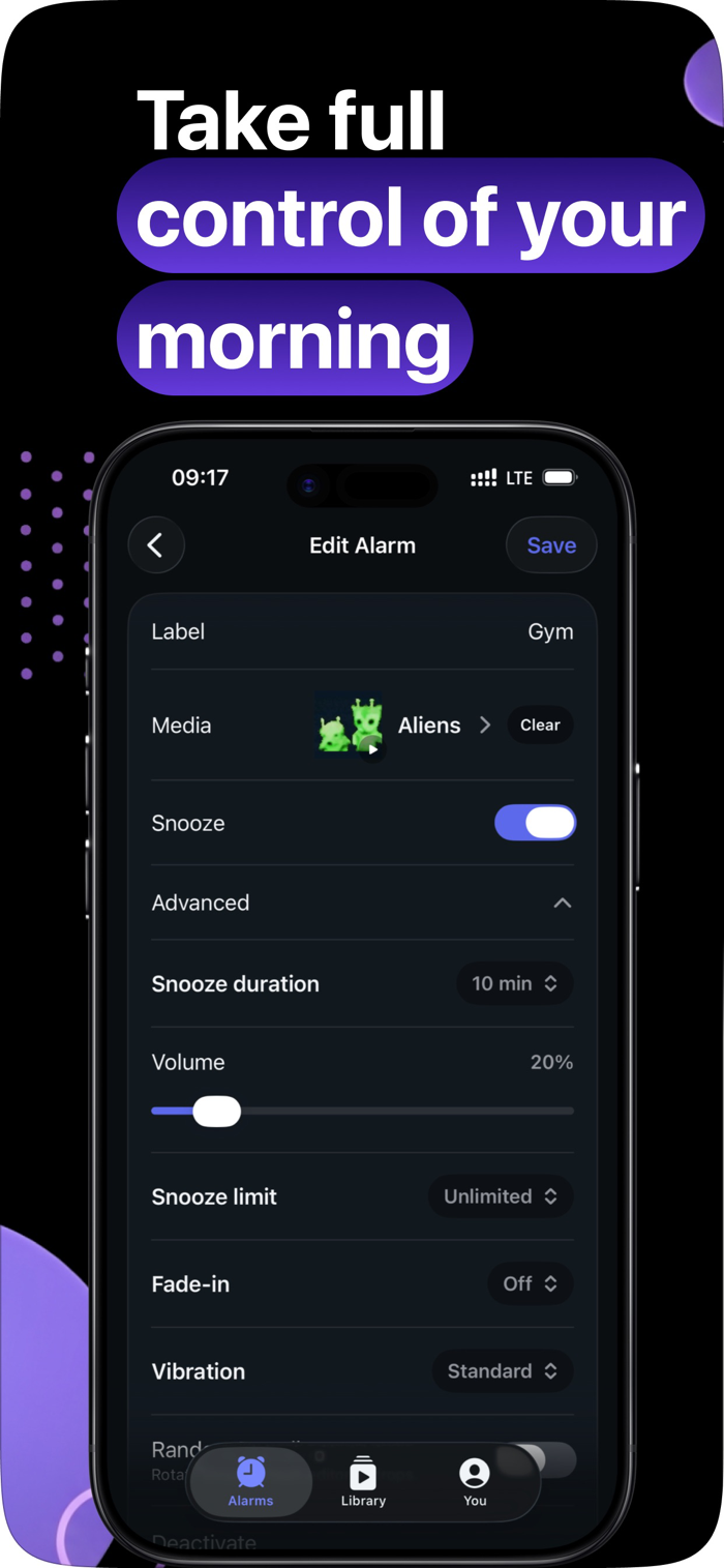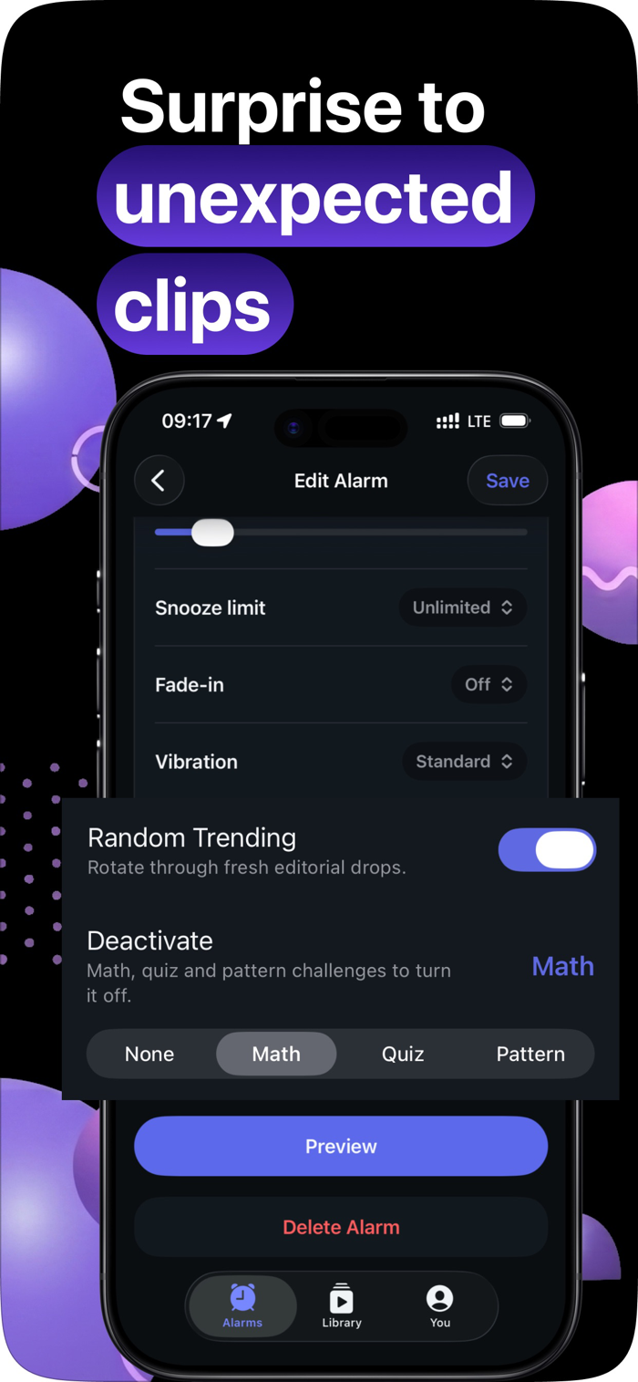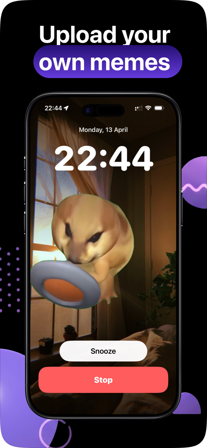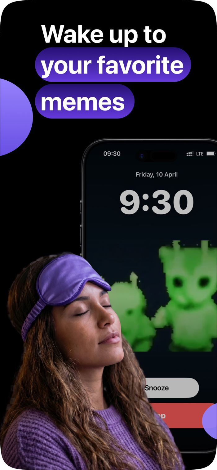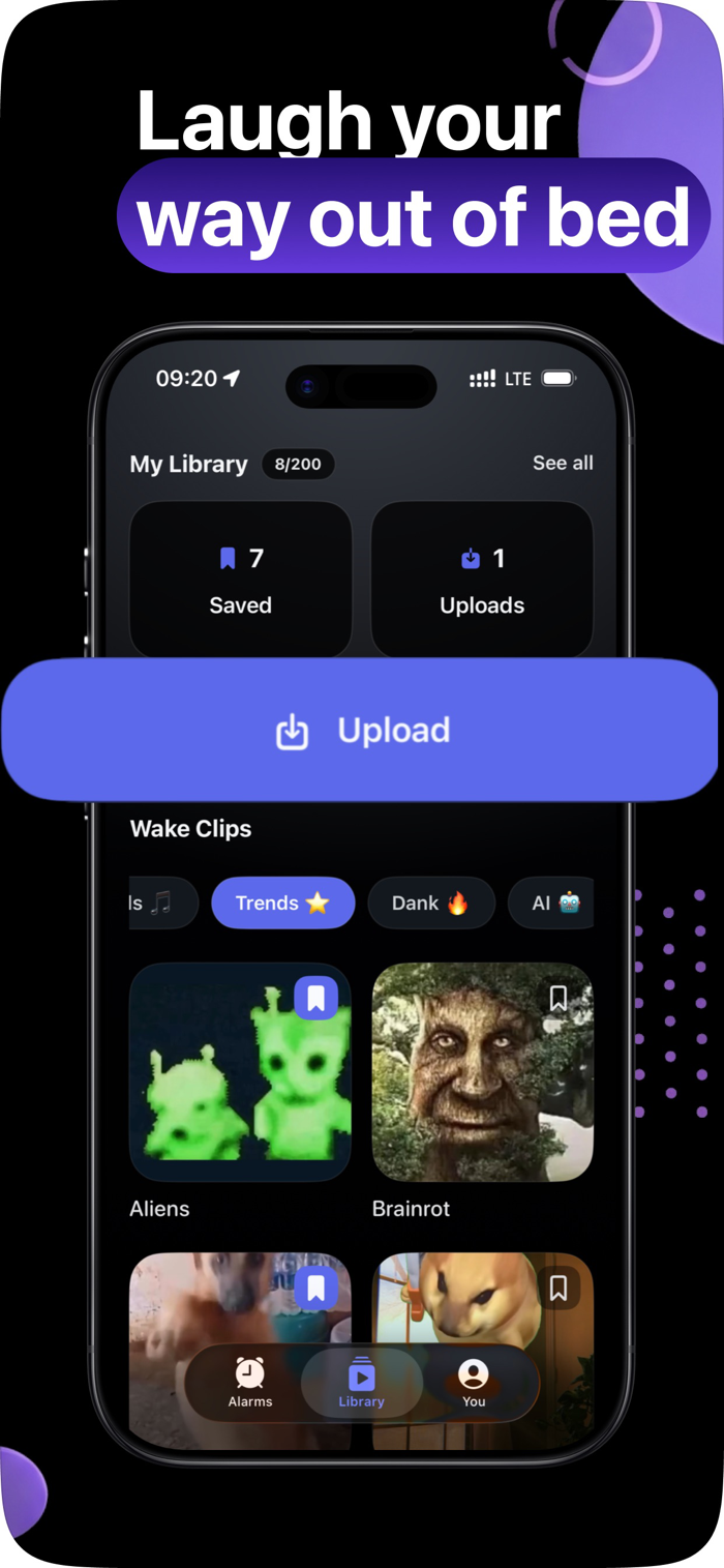 Choose from a library of memes, trending wake clips, and alarm sounds, or upload your own videos from Photos and Files. Build an alarm in seconds, customize how it rings, and make every wake-up feel personal.