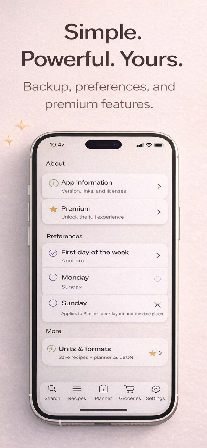 Ready4meal is a beautifully simple, offline-first meal planning app designed to help you organize recipes, plan your week, and manage groceries — all in one place.