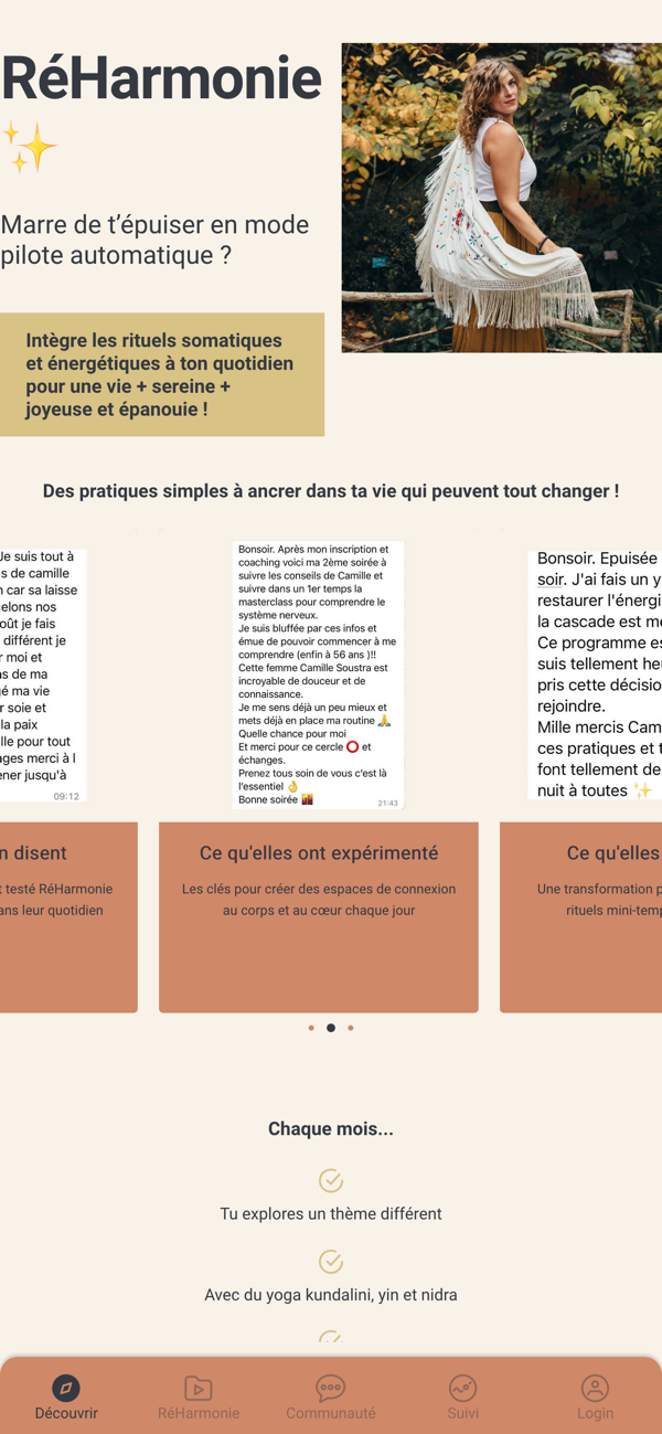 RéHarmonie est l'application de bien-être holistique qui t'accompagne vers l'équilibre intérieur à ton rythme, où que tu sois, quand tu en as besoin.