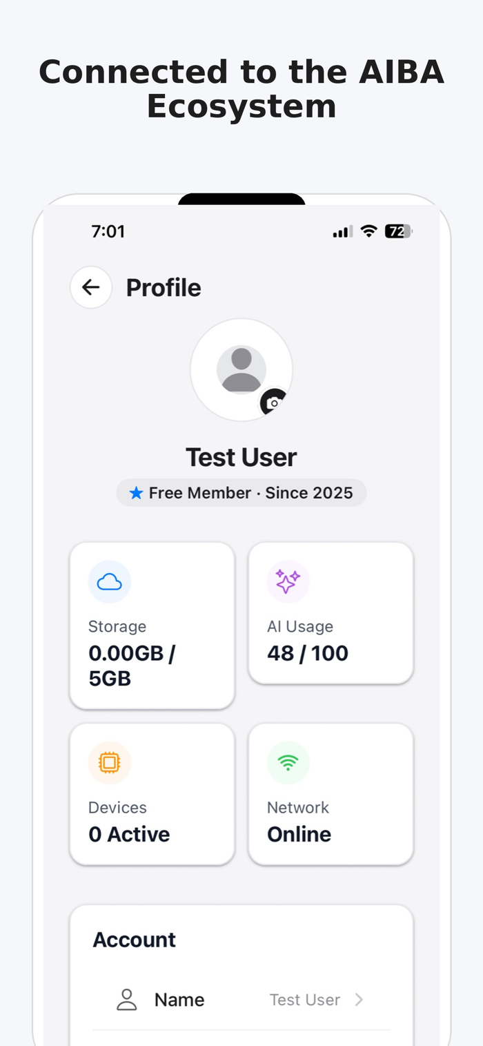 Save photos, videos, files, and notes across your AIBA devices. Manage your personal cloud storage included with your plan.