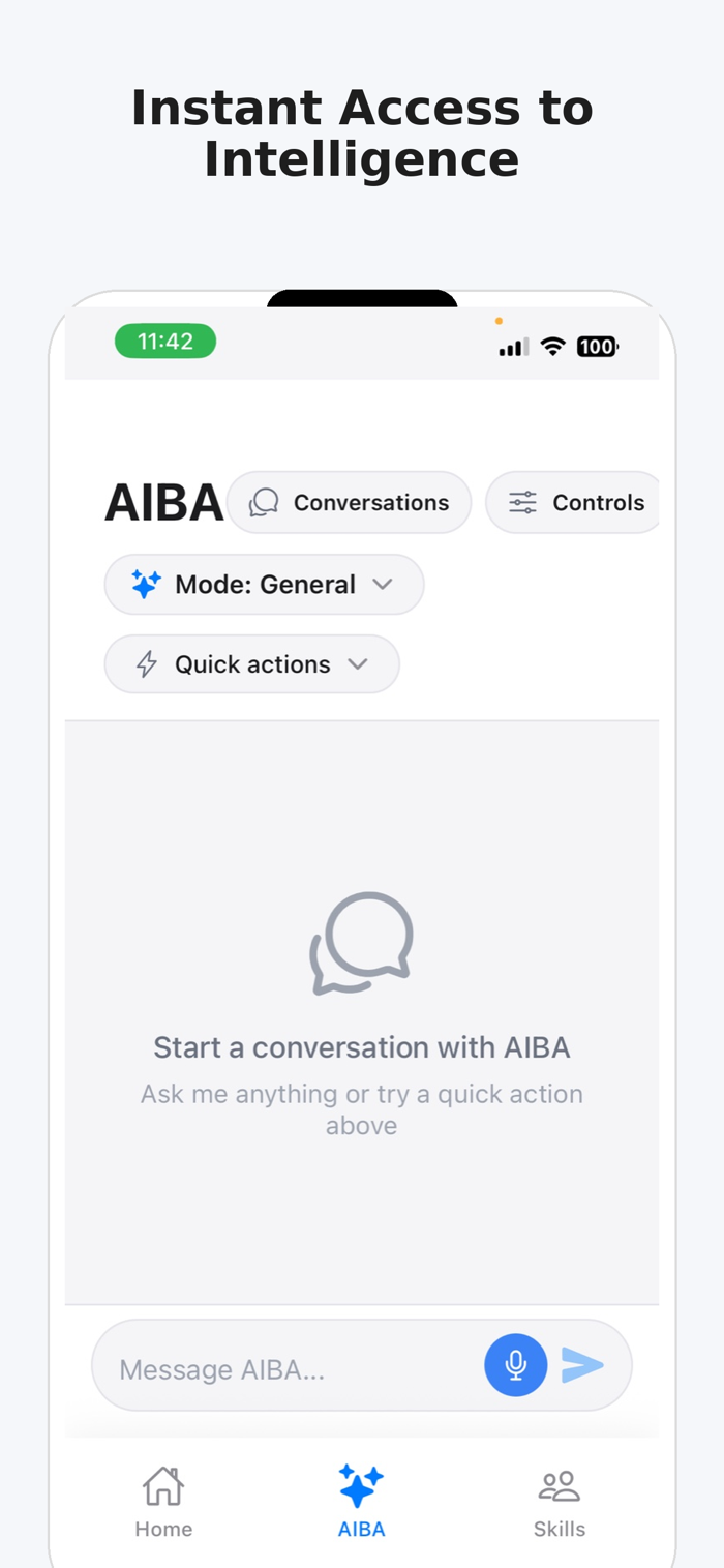 Talk to your AI through your AIBA Mini or phone—ask questions, execute tasks, send messages, schedule events, automate workflows, and more.
