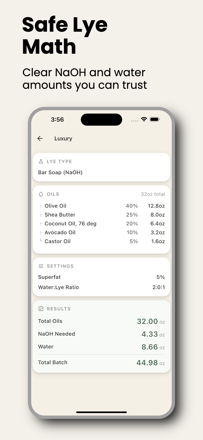 Whether you're creating your first recipe or refining a favorite formula, Simple SoapCalc helps you calculate safe lye and water amounts without spreadsheets, clutter, or guesswork.