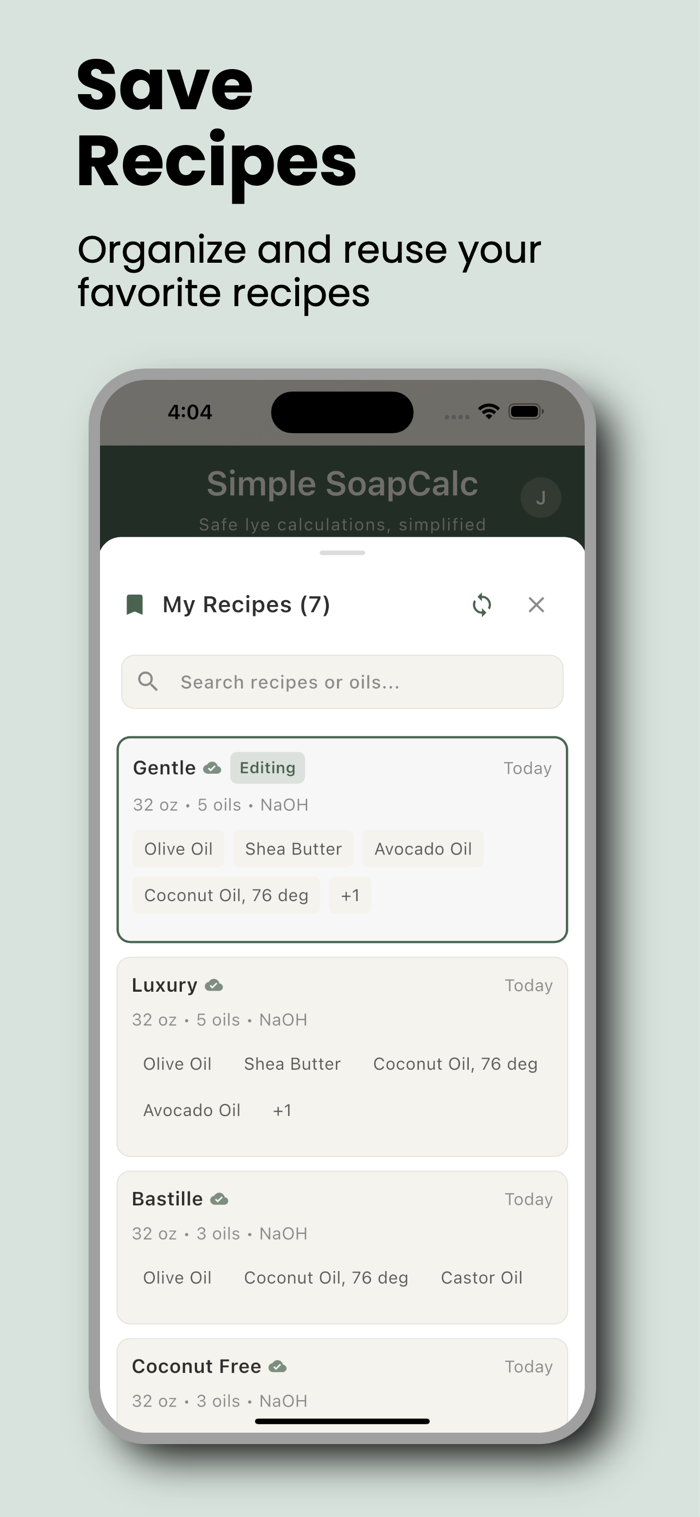 I got tired of soap calculators that made simple things feel complicated — and of losing recipes I discovered in books, online, and while watching other soapmakers, because getting them into a calculator was such a hassle. I wanted a fast, reliable way to get safe lye amounts and bring those recipes home without friction. So I built Simple SoapCalc.