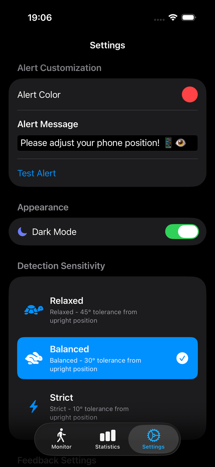 PostureGuard帮你告别“短信脖”,养成良好姿势。它是后台运行的个人助手,能在你刷社交媒体、读邮件或看视频时,悄悄监测设备角度,当你坐姿不佳时及时轻推提醒。具备后台监测功能,使用其他应用甚至手机锁屏时也能无缝工作;实时提醒,姿势不对马上震动或发声;有详细统计数据助你追踪进步;还能个性化设置提醒方式、声音和主题。