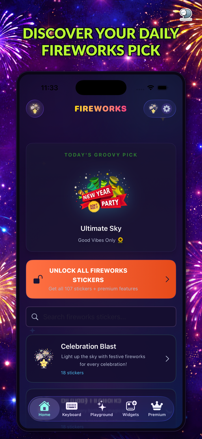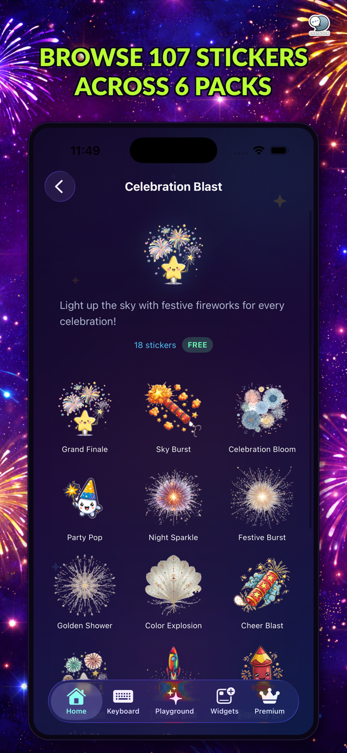 Fireworks Emoji Stickers为iPhone带来活力十足的庆祝贴纸,涵盖信息、键盘、小组件及Apple Watch。有107个烟花贴纸分6个主题包,含40个免费贴纸。具备iMessage贴纸浏览器、自定义键盘、小组件等。免费功能有2个免费贴纸包、表情生成器等。付费解锁可获得全部贴纸、无广告体验及更多高级功能,适用于生日、派对等场景。