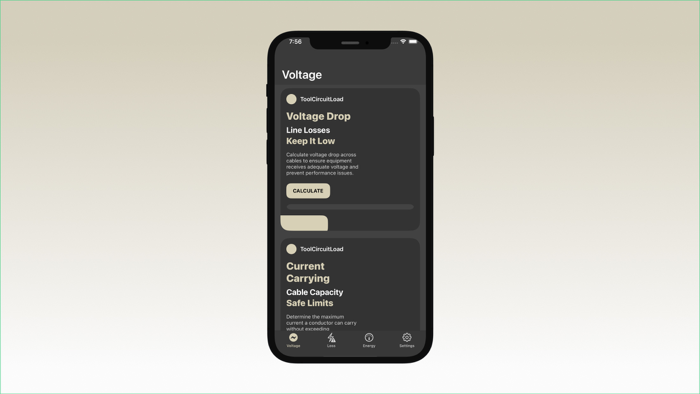 ToolCircuitLoad is a app made for basic electrical calculations. It helps users understand how voltage, current, resistance, and power work in a circuit. The app includes tools like voltage drop, current capacity, resistance, and short circuit current calculators.\n\nYou can also estimate power loss, electrical heating, and energy usage with ease. It helps check power efficiency and balance electrical loads safely. The app is designed with clear inputs and easy results for quick use.\n\nToolCircuitLoad is useful for, and anyone working with electrical systems. Our goal is to make electrical calculations easy, fast, and reliable for everyone.