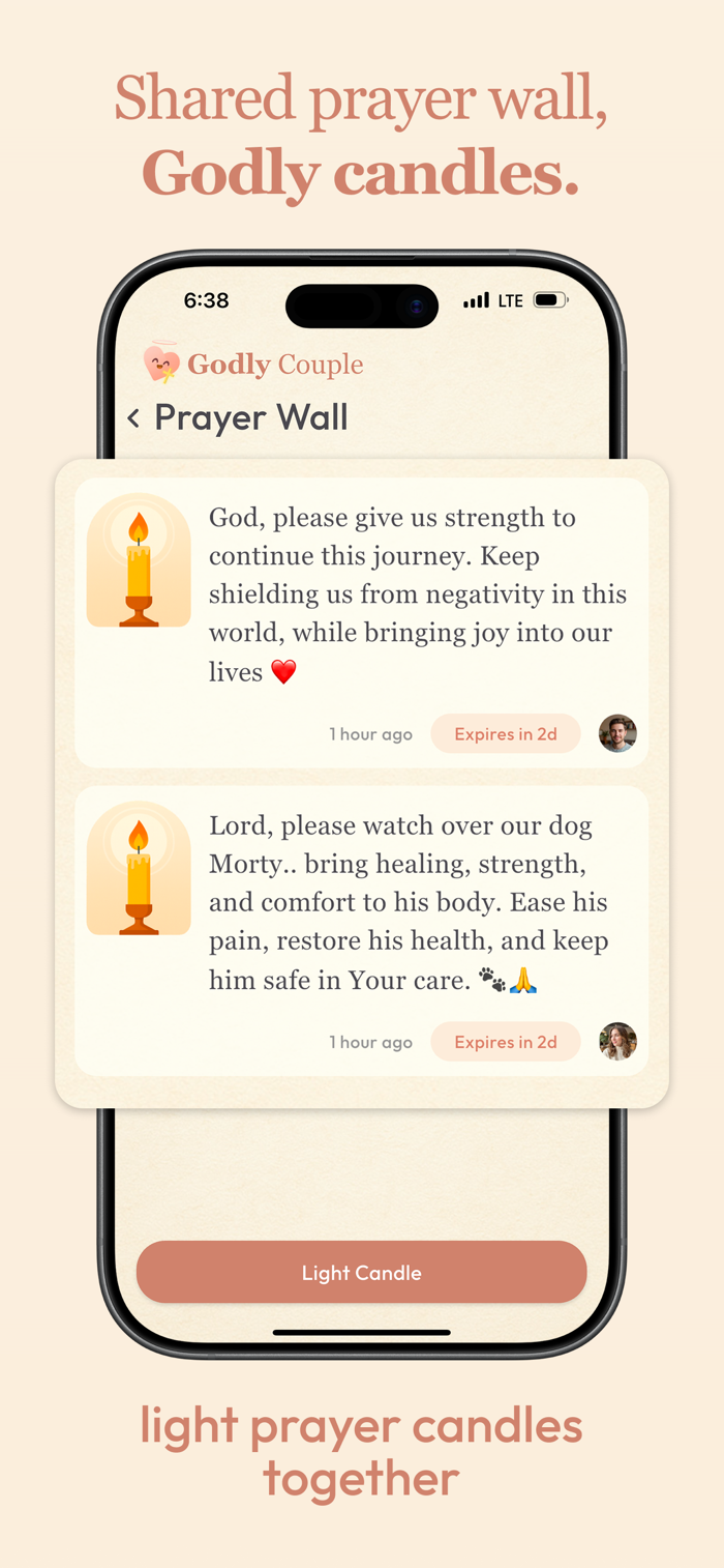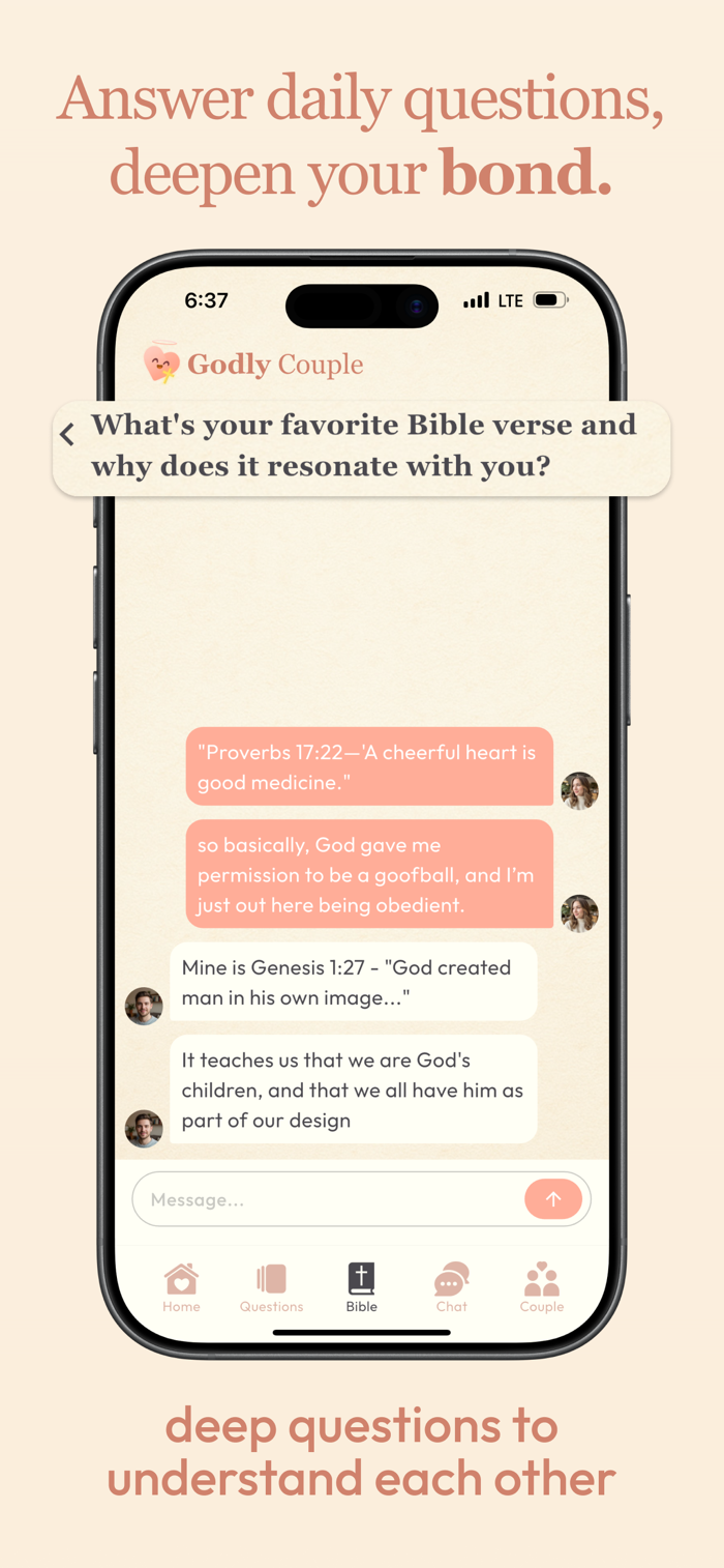 Connect your accounts and experience everything in real time. See each other's progress, shared answers, and prayer updates. Whether you are in the same room or in a long-distance relationship, Godly keeps you spiritually connected.